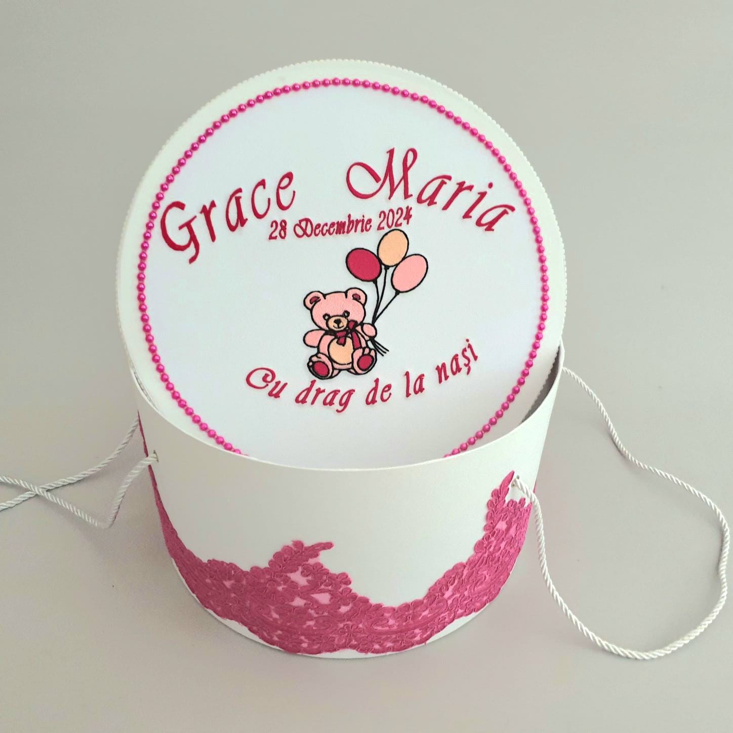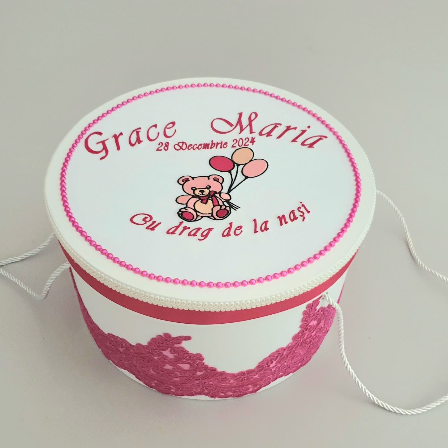 Cutie trusou botez personalizata Ursulet cu Baloane fuchsia