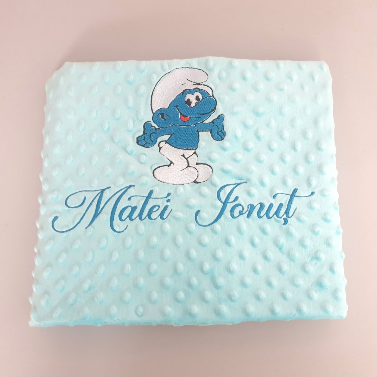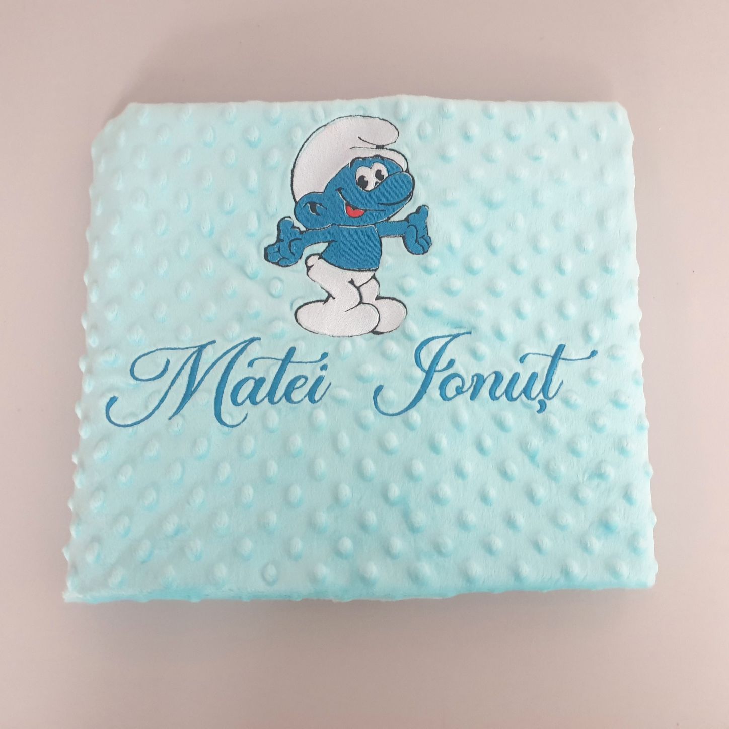 Paturica turcoaz pentru baieti Personalizata cu Strumfi