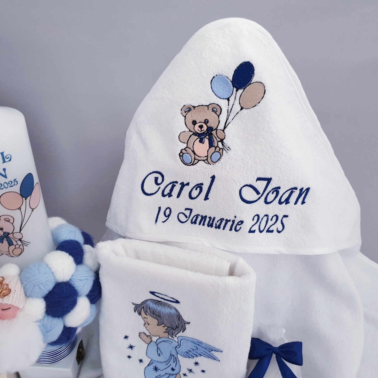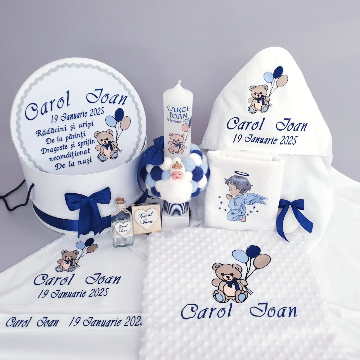 Trusou botez Personalizat Ursulet Baloane cu Lumanare si Cutie Trusou