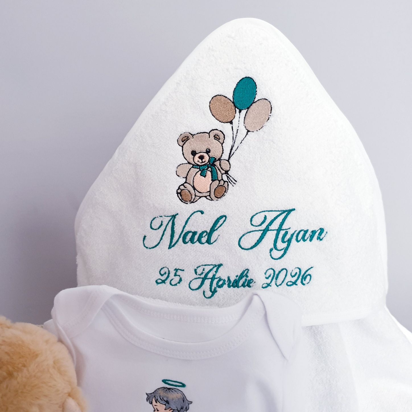 Trusou Botez Personalizat Ursulet cu Baloane,crem-verde