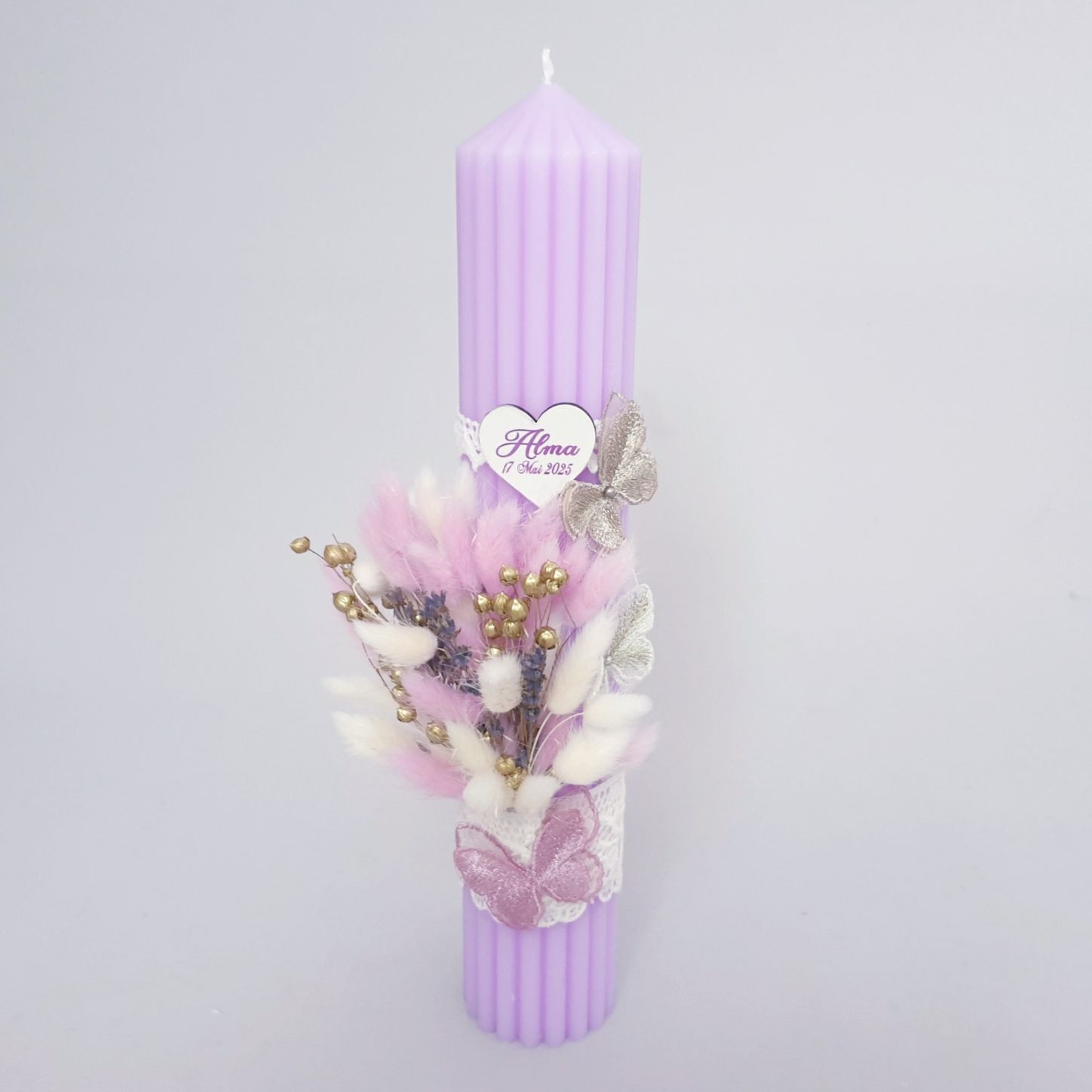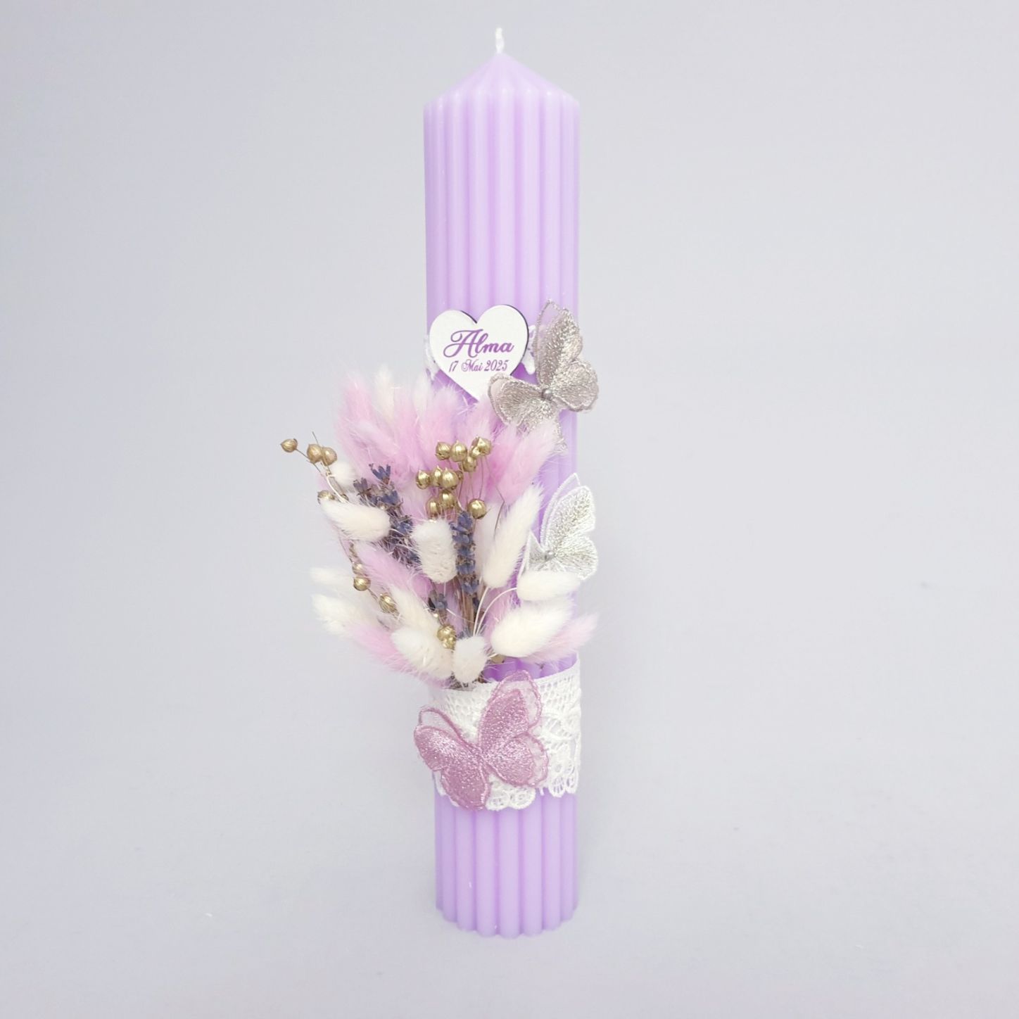 Lumânare de botez din parafina cu model de culoare lila ,decorata manual cu aranjament floral. Lumanarea vine personalizata cu numele bebelusului pe o inimioara de lemn gravata manual atasata aranjamentului floral.