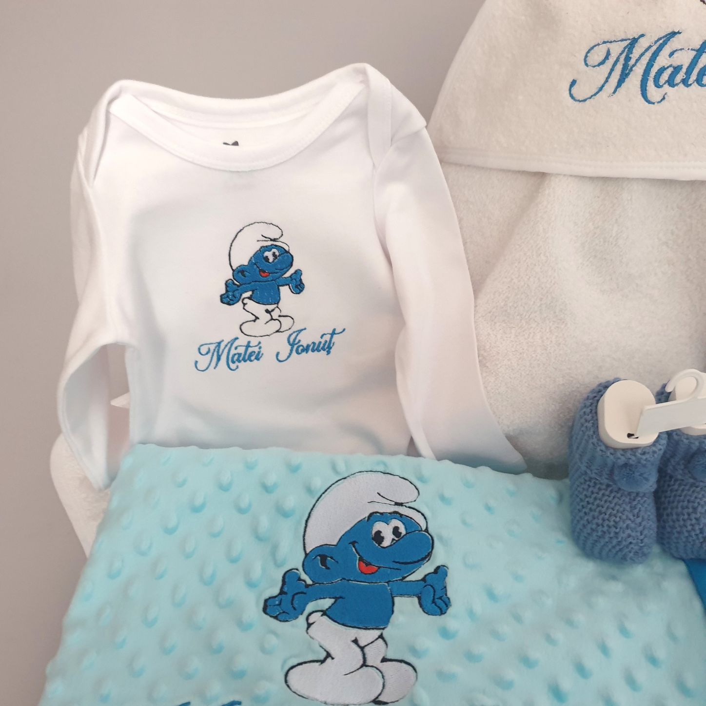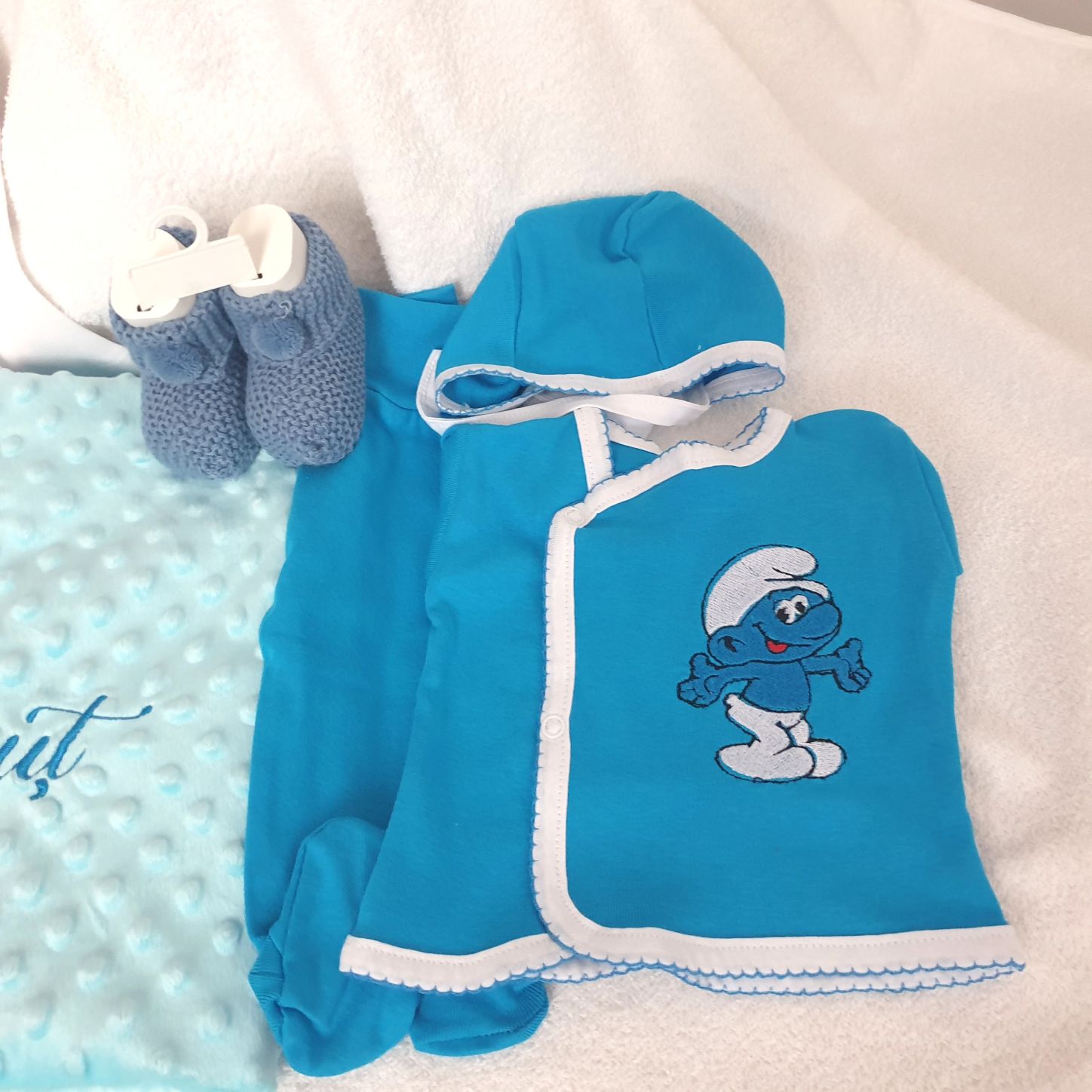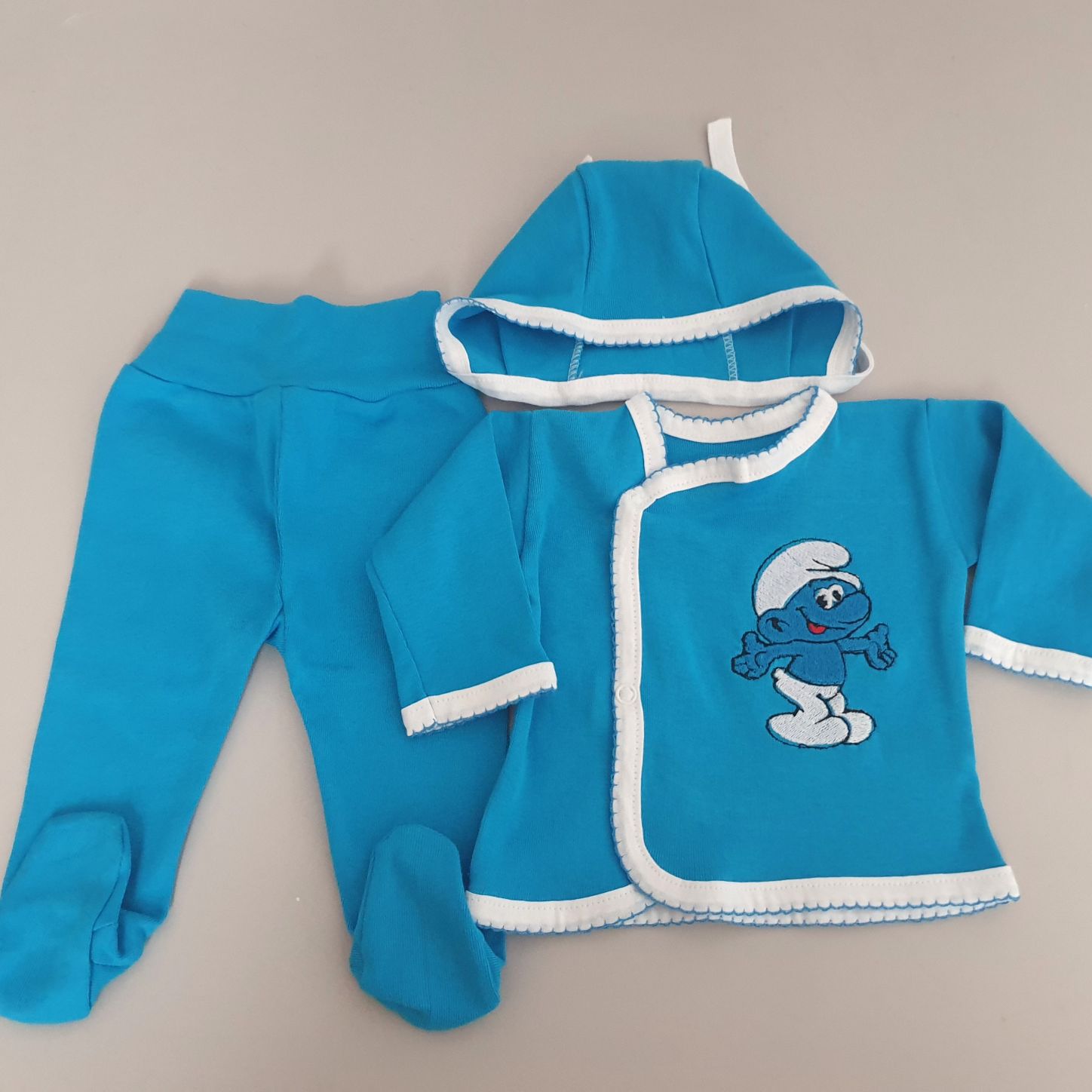 - Costumas 3 piese din bumbac : bluza, caciulita, pantalon bata.Bluza contine broderie cu imagine Strumfi.Marimea 0-2 luni.Produs fabricat in Romania