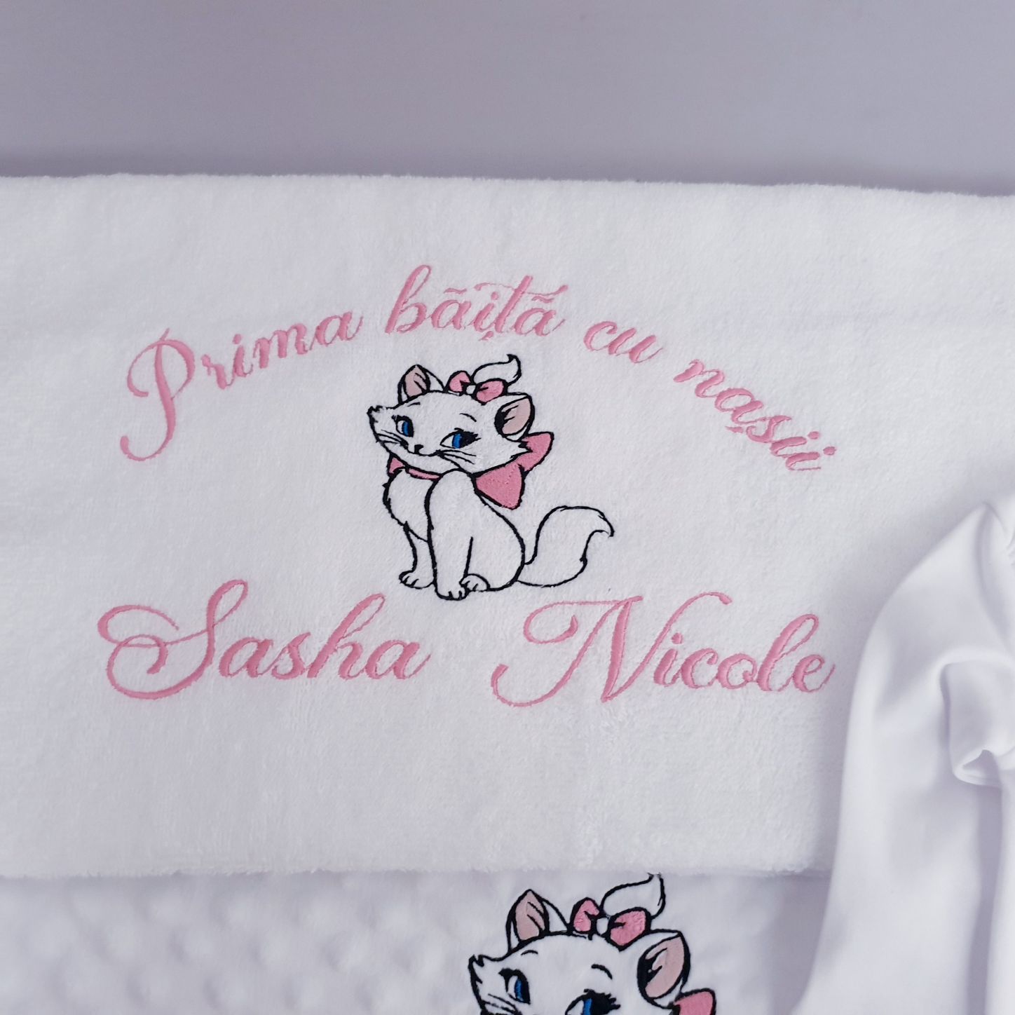 - Paturica Minky, alba ,personalizata prin broderie cu Pisica aristocrata,nume si data nasterii, 80x100cm.