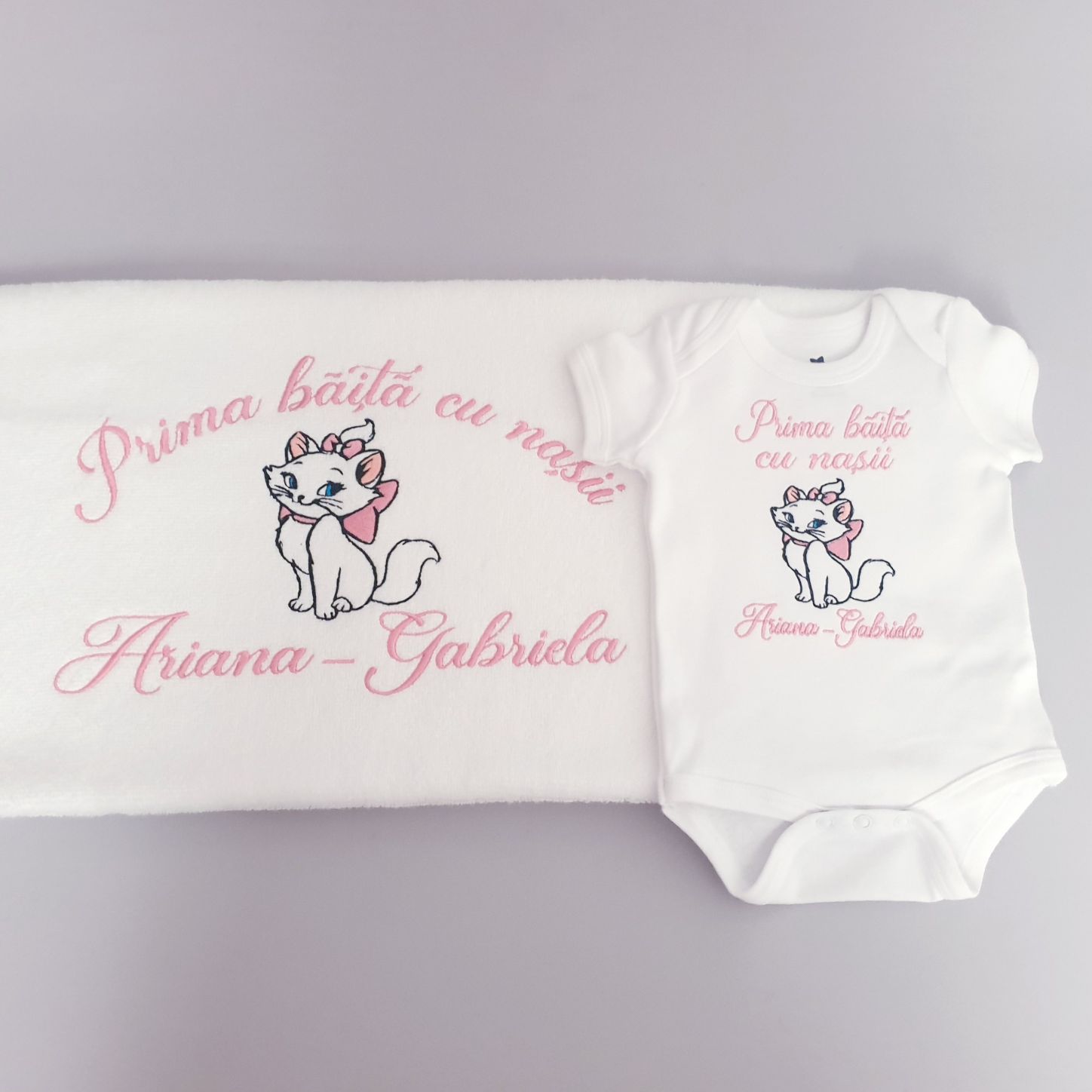 - Body maneca lunga sau scurta personalizat prin broderie cu imagine+nume +mesaj „Prima baita cu nasii”,din bumbac organic.Body se inchide in partea de jos cu 3 capse.(Dimensiun body:56,62,68,74,80,86,92)