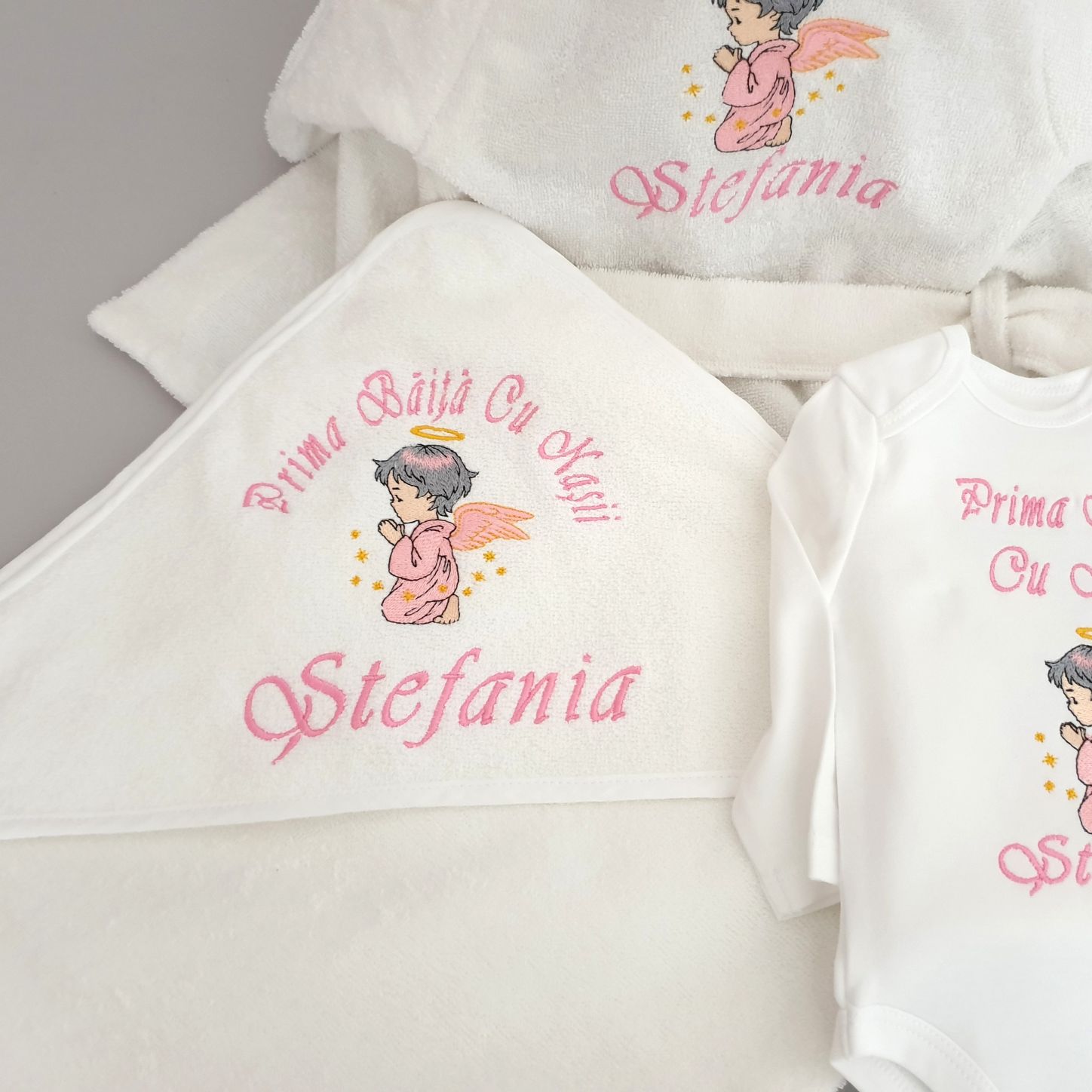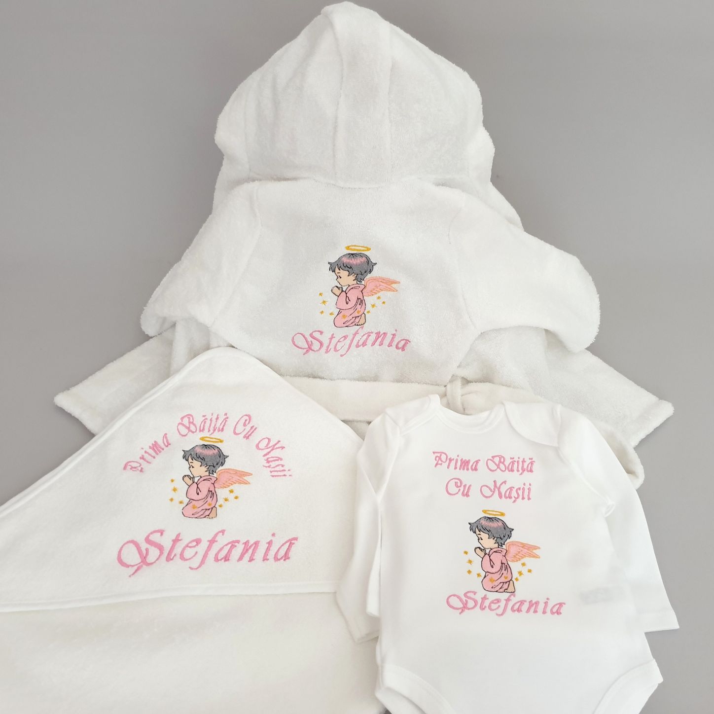 - Halatul de baie cu gluga personalizat cu imagine+nume confectionat din frotir/prosop premium, 350g/mp , este fabricat din bumbac 100%. Datorita materialului de calitate superioara, absoabe apa de pe corp rapid dar in acelasi timp incalzaste corpul copilasului. Halatele din prosop premium pentru copilasi dau un sentiment placut de confort chiar si pentru micutii jucausi. Cordonul din talie asigura o fixare cat mai stabila.