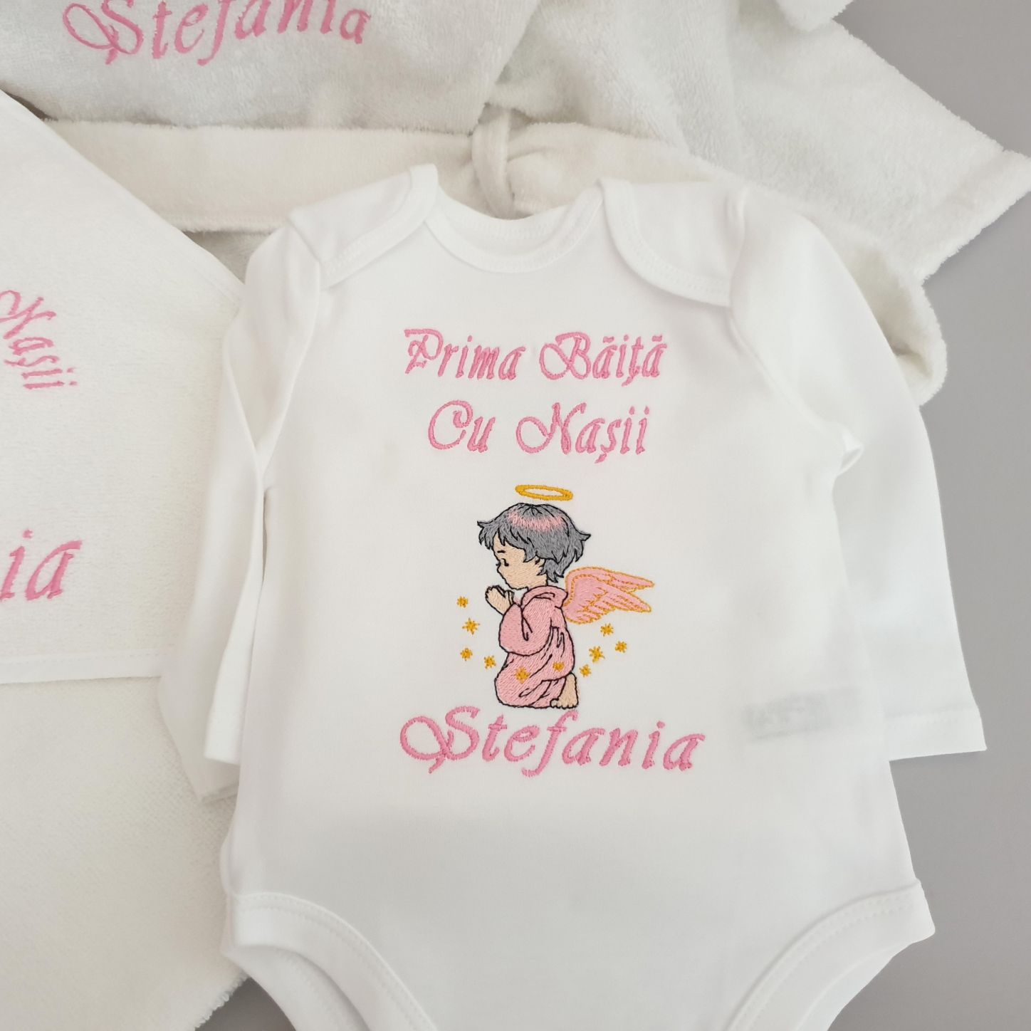 - Body maneca scurta sau lunga personalizat cu imagine+nume+mesaj „Prima baita cu nasii”,din bumbac.Body se inchide in partea de jos cu 3 capse