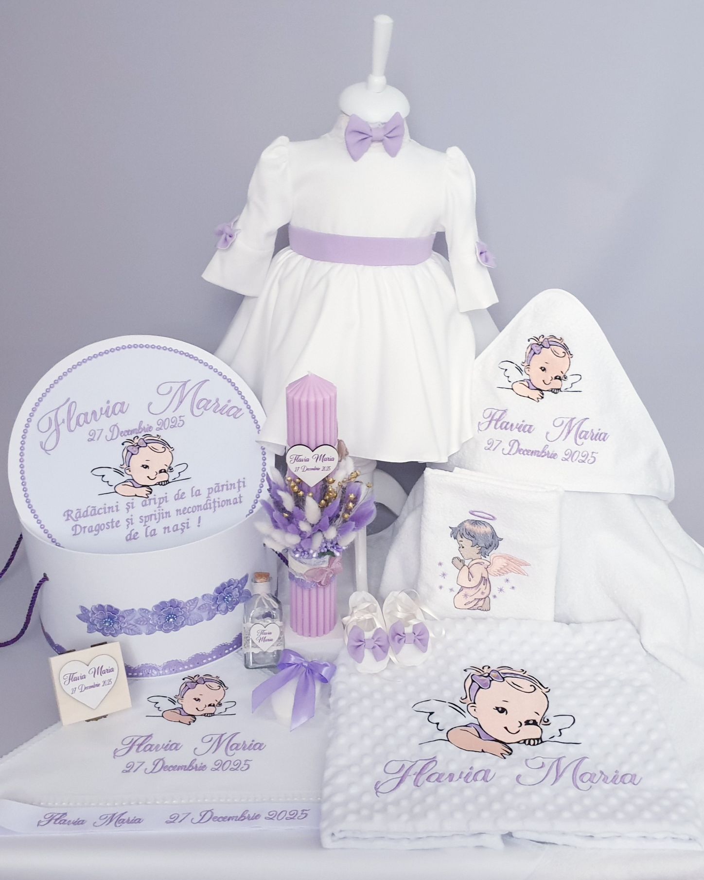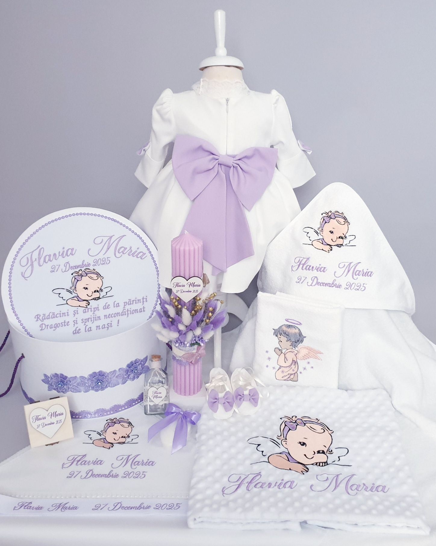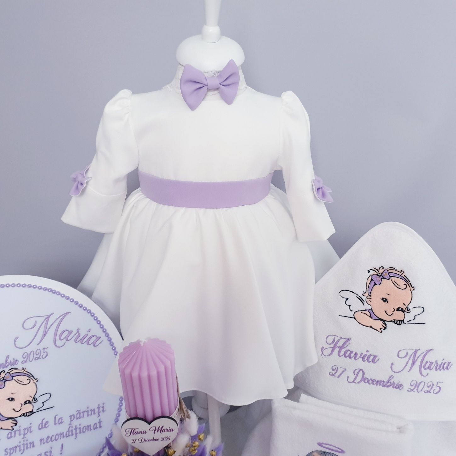11.Rochita botez alba cu o fundă lila mare la spate într-o culoare vie cu maneca lunga sau scurta, această ținută adaugă un strop de farmec fiecărei apariții.Mânecuțele sunt decorate cu fundițe elegante de culoare lila oferind un plus de sofisticare.Setul complet include o bentiță delicată cu fundiță și papucei adorabili, asortați perfect cu rochița.Aceasta rochita de botez redefineste eleganta si puritatea, fiind creata special pentru un moment unic si deosebit.Sistem de inchidere: cu fermoar la spate. Produs fabricat in Romania