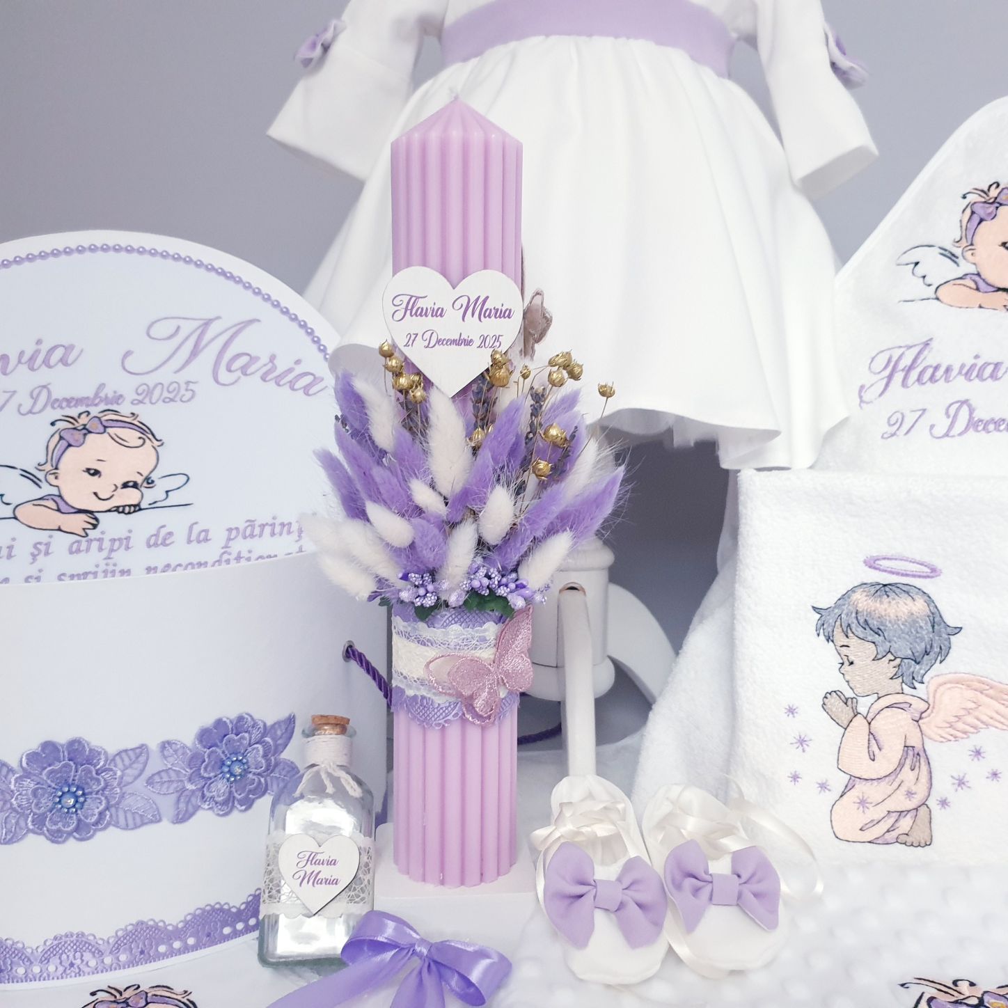 1. Lumânare de botez din parafina cu model canelat de culoare lila (6.5 x 35 cm),decorata manual cu aranjament floral si fluturasi. Lumanarea vine personalizata cu numele bebelusului pe o inimioara de lemn gravata manual atasata aranjamentului floral.