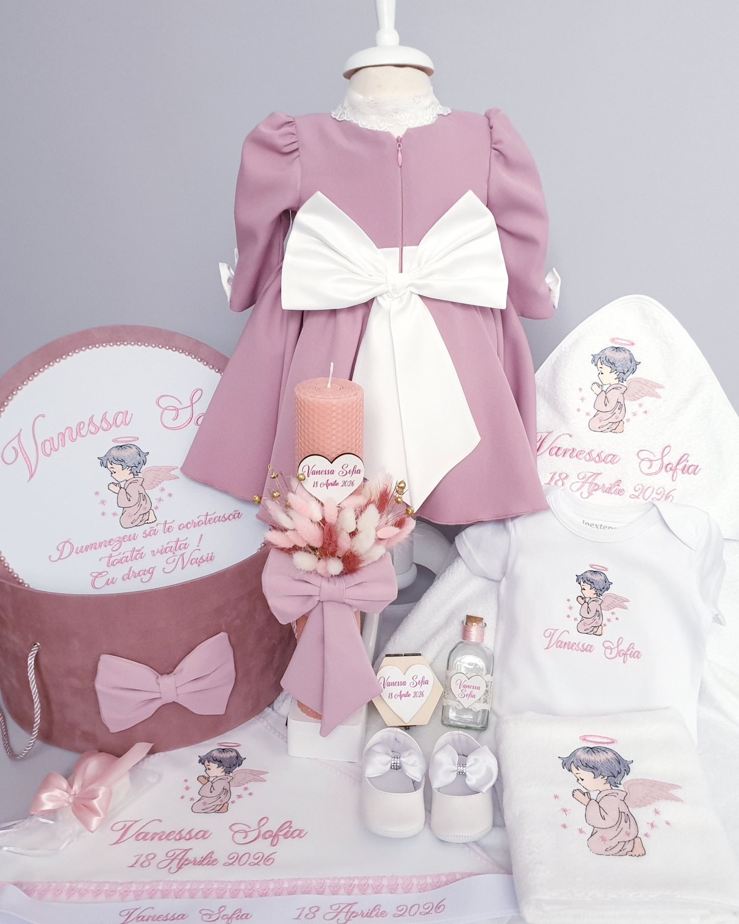11.Rochita botez roz pudra cu o fundă mare la spate de culoare alba cu maneca lunga sau scurta, această ținută adaugă un strop de farmec fiecărei apariții.Mânecuțele lungi sunt decorate cu fundițe elegante albe, oferind un plus de sofisticare.Setul complet include o bentiță delicată cu fundiță alba .Aceasta rochita de botez redefineste eleganta si puritatea, fiind creata special pentru un moment unic si deosebit.Sistem de inchidere: cu fermoar la spate. Produs fabricat in Romania