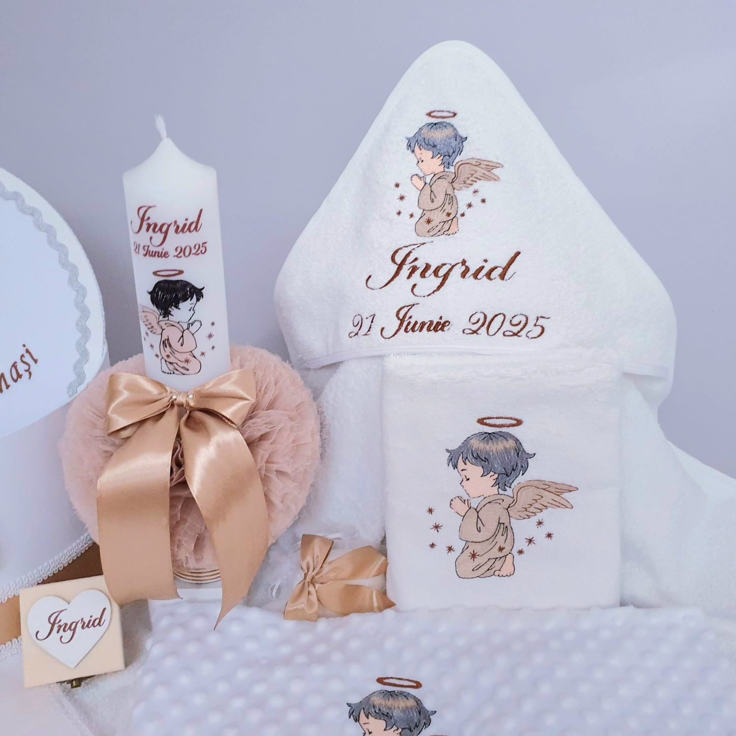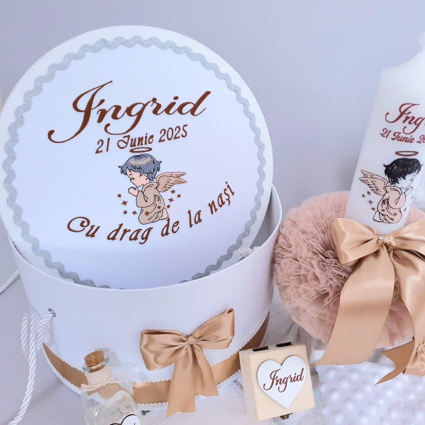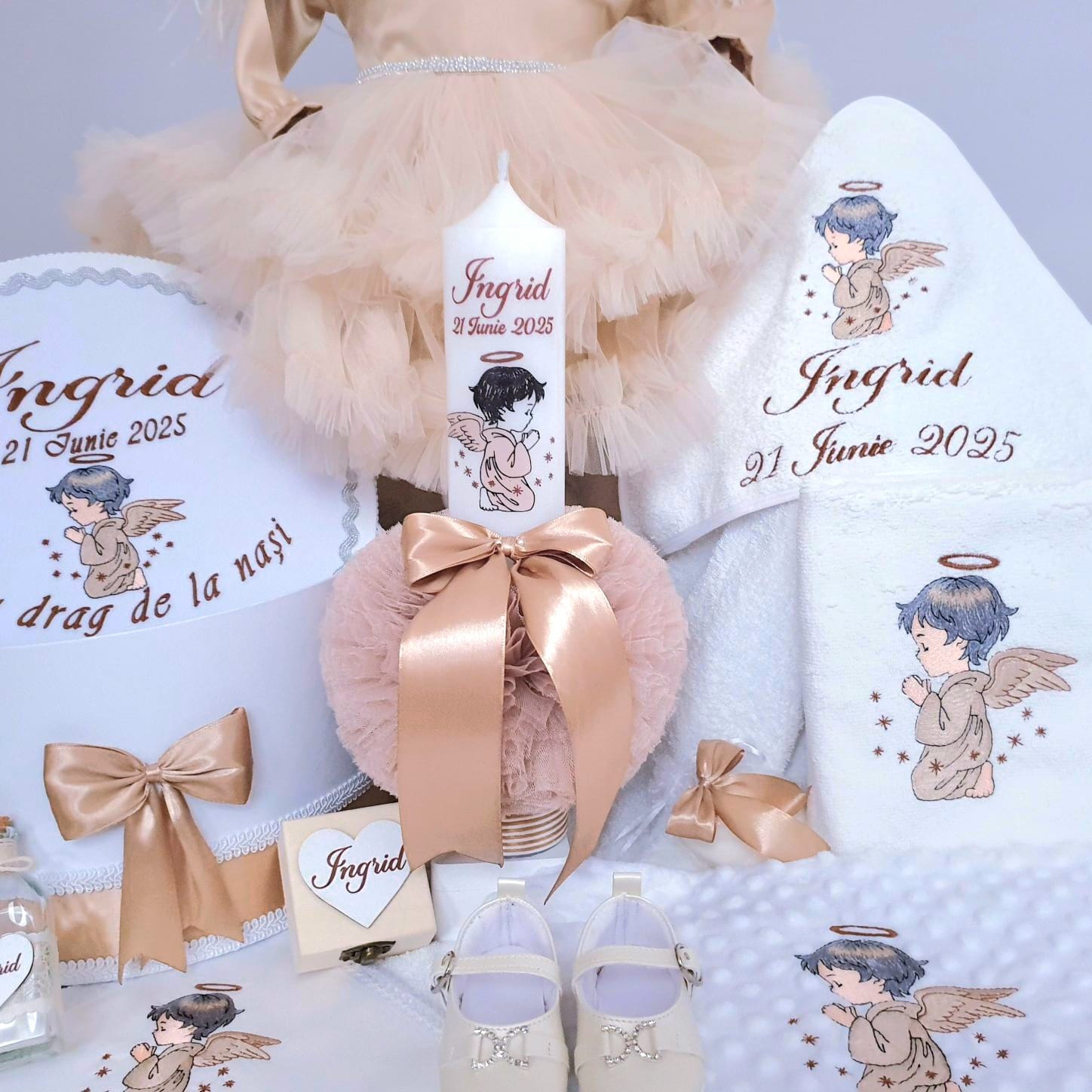 1. Lumânare de botez personalizată cu imagine+nume+data(6.5 x 35 cm).Imaginea cu Ingerasul,numele si data sunt imprimate in ceara,decorata cu tiul crem, snur satinat si funda saten maro