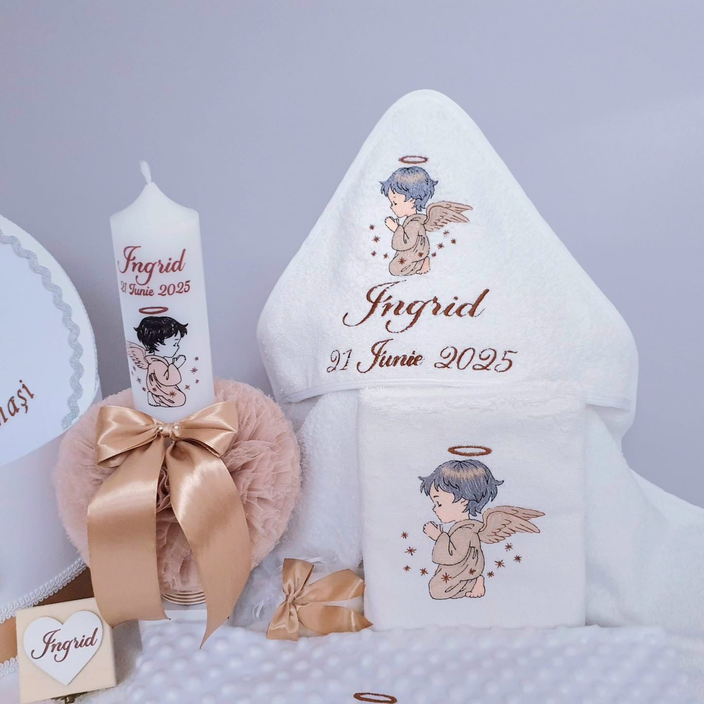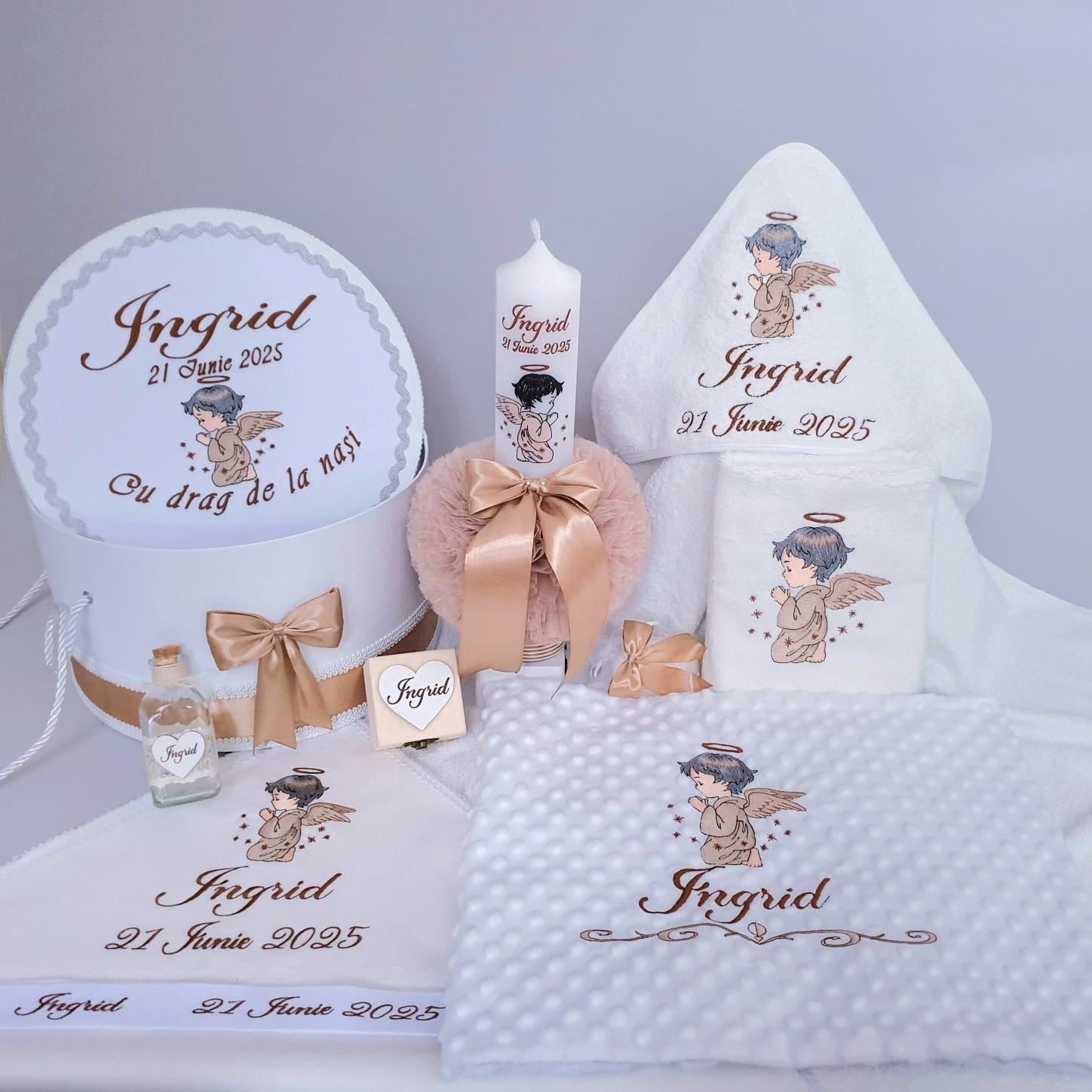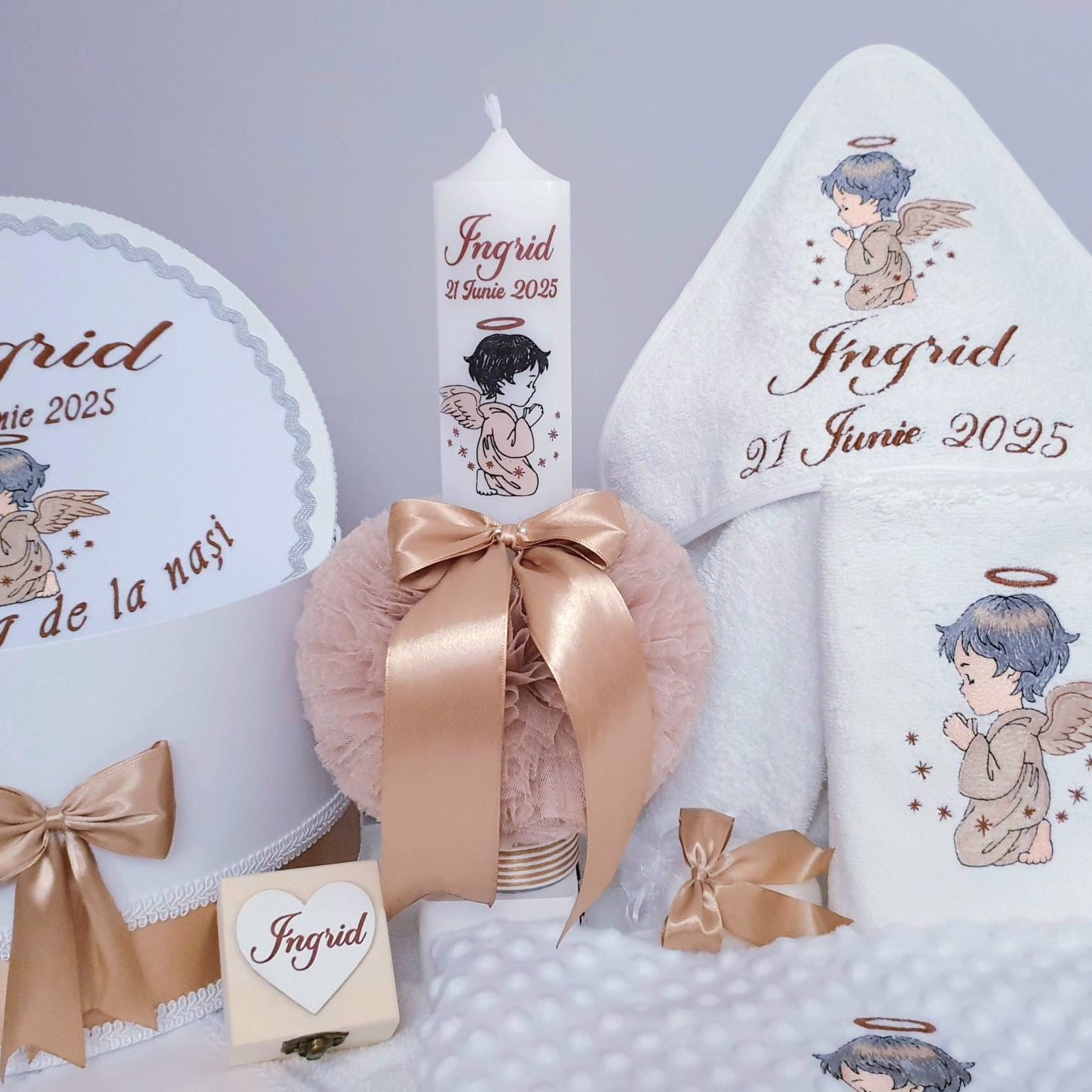 1. Lumânare de botez personalizată cu imagine+nume+data(6.5 x 35 cm).Imaginea cu Ingerasul,numele si data sunt imprimate in ceara,decorata cu tiul crem, snur satinat si funda saten maro
