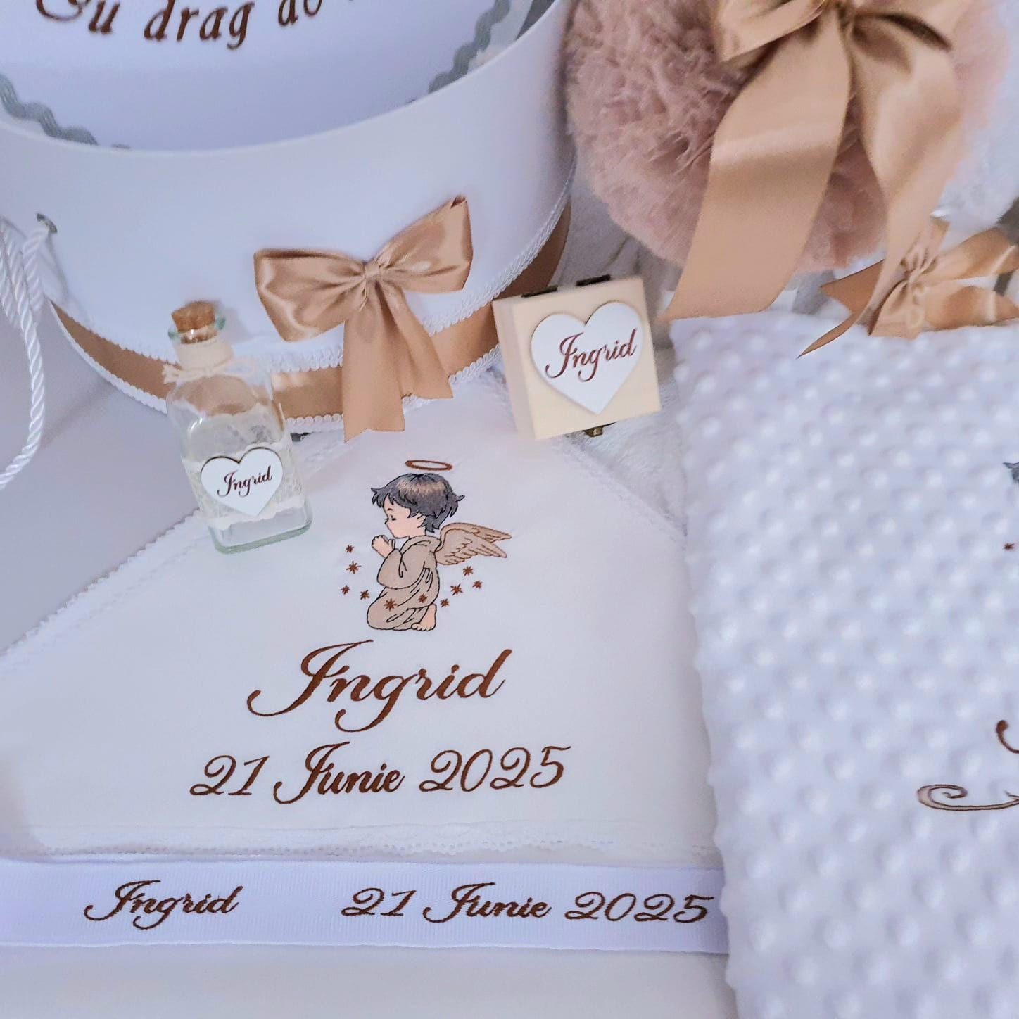 2. Cutie pentru trusou personalizată prin brodare cu numele bebelușului , imagine si data. Dimensiuni cutie: diametru 35 cm / înălțime 20 cm