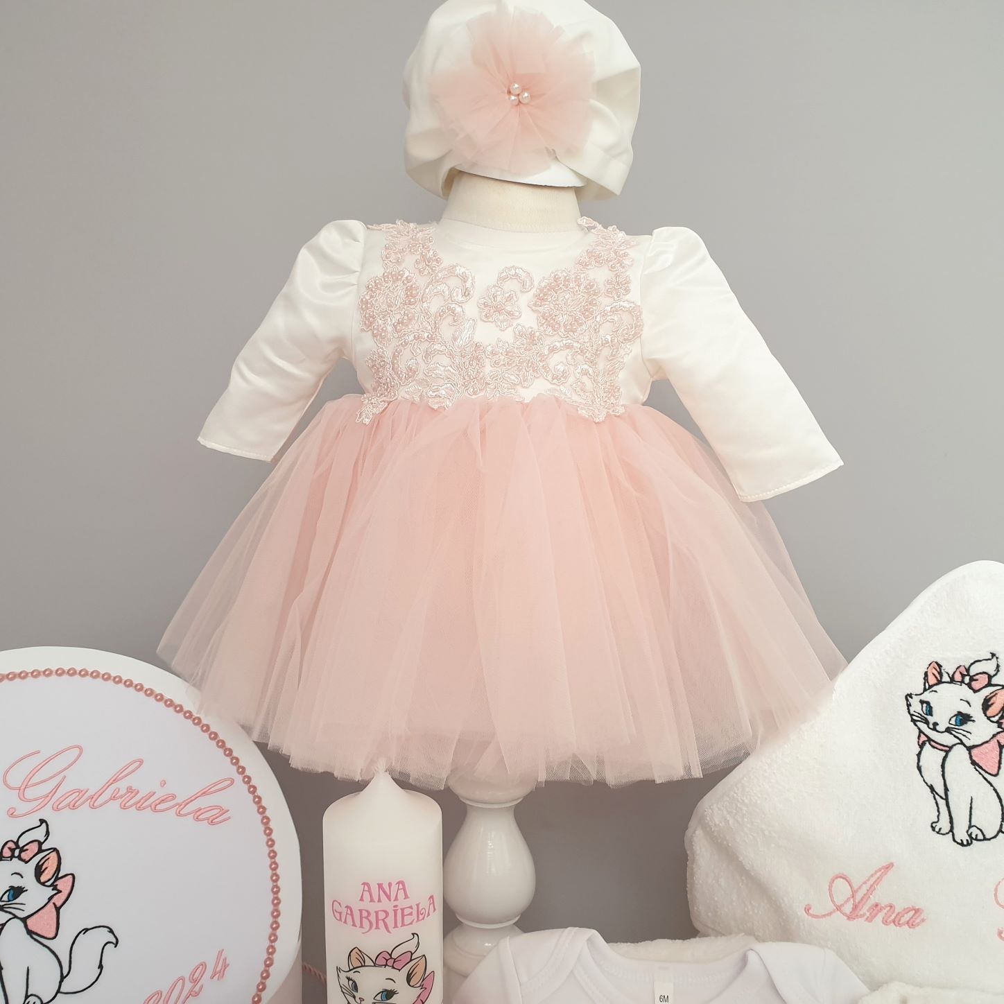 13.Rochita botez roz deschis cu mâneca lunga.Compleul conține 4 piese: rochiță, bolero, turban, chiloței. Este o rochiță manufacturată din tafta și multe straturi crețe de tull. Accentul rochiței este redat cu ajutorul broderiei 3d, organice, florale în culori asortate tullului, broderia urmează linia bustului.