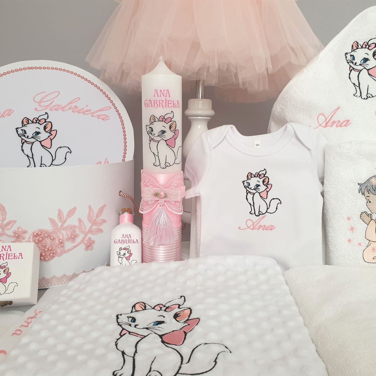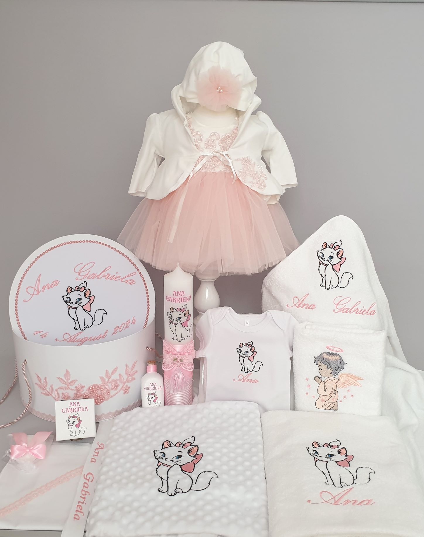 2. Cutie pentru trusou personalizată prin brodare cu numele bebelușului ,data evenimentului(sau data nasterii) si imaginea cu pisica aristocrata
