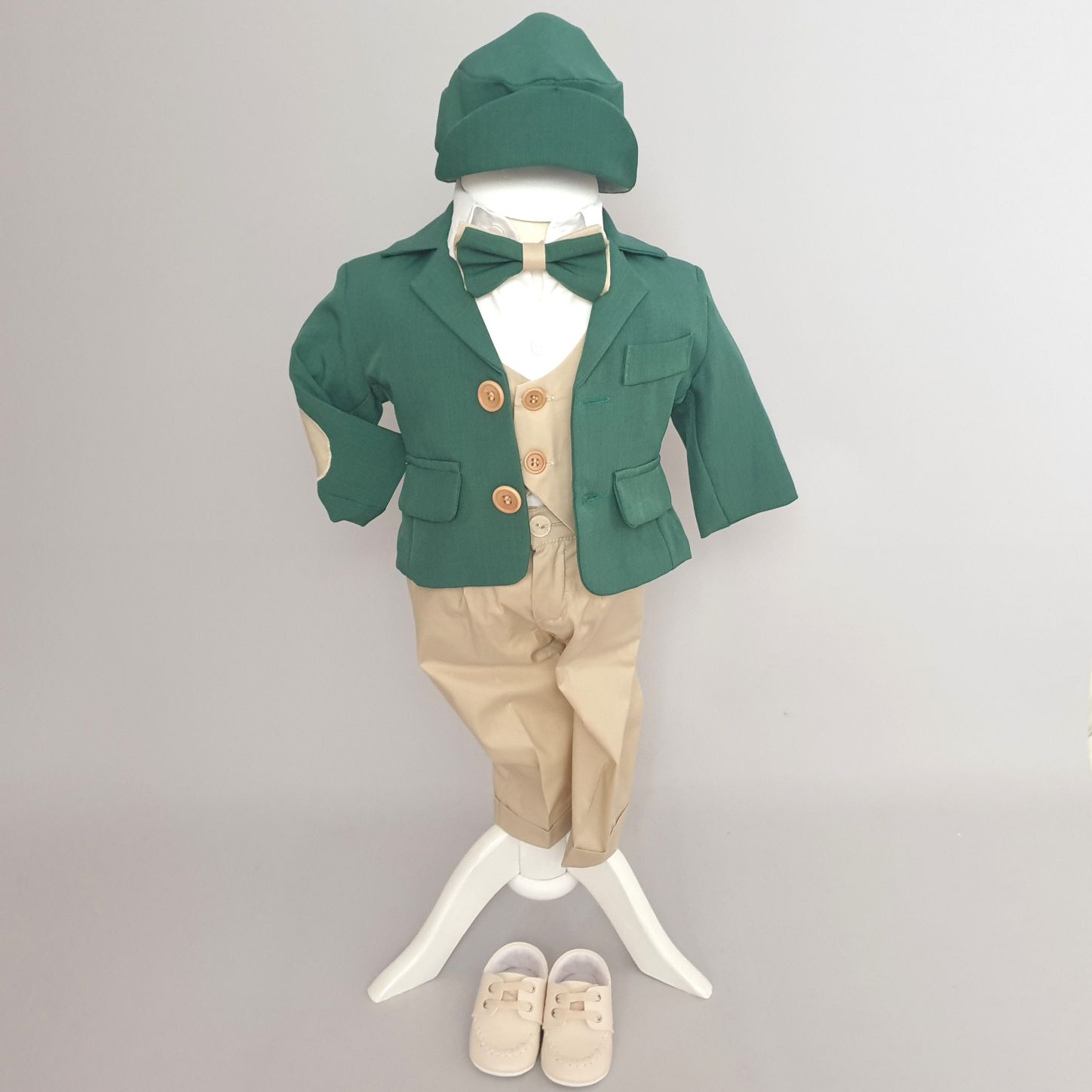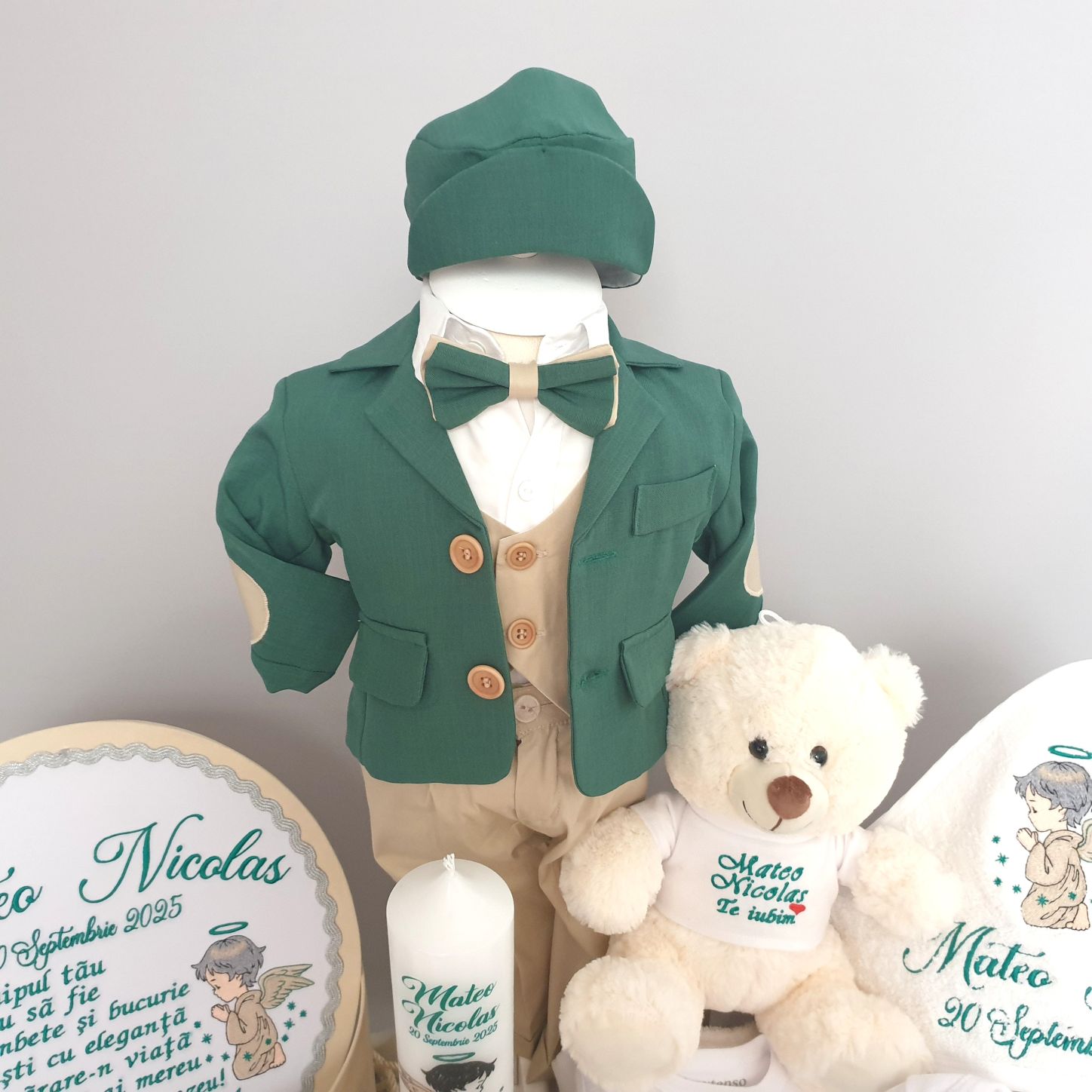 12.Costum de culoare verde-crem alcatuit din 5 piese: camasa tip body cu vesta aplicata, papion, pantaloni, sacou si bascuta.