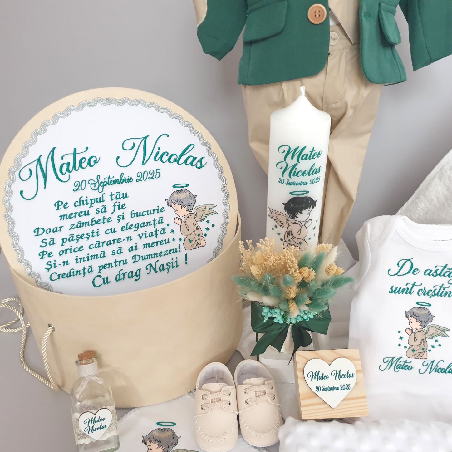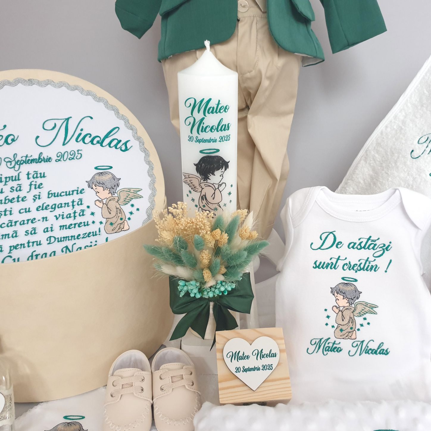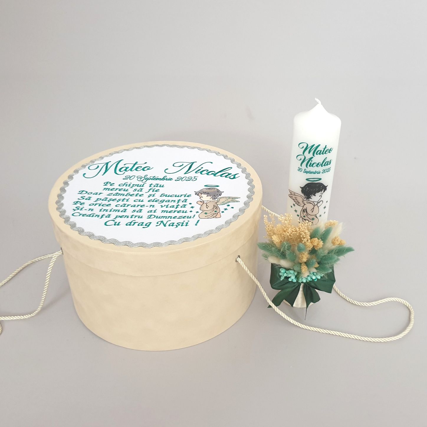 1. Lumânare de botez personalizată cu imagine+nume+data(6.5 x 35 cm).Lumanarea este realizata handmade, imaginea si numele sunt imprimate in ceara ,este decorata cu aranjament floral. Această lumânare este un produs special creat pentru a aduce o notă de eleganță și tradiție în ceremonia copilului tău.