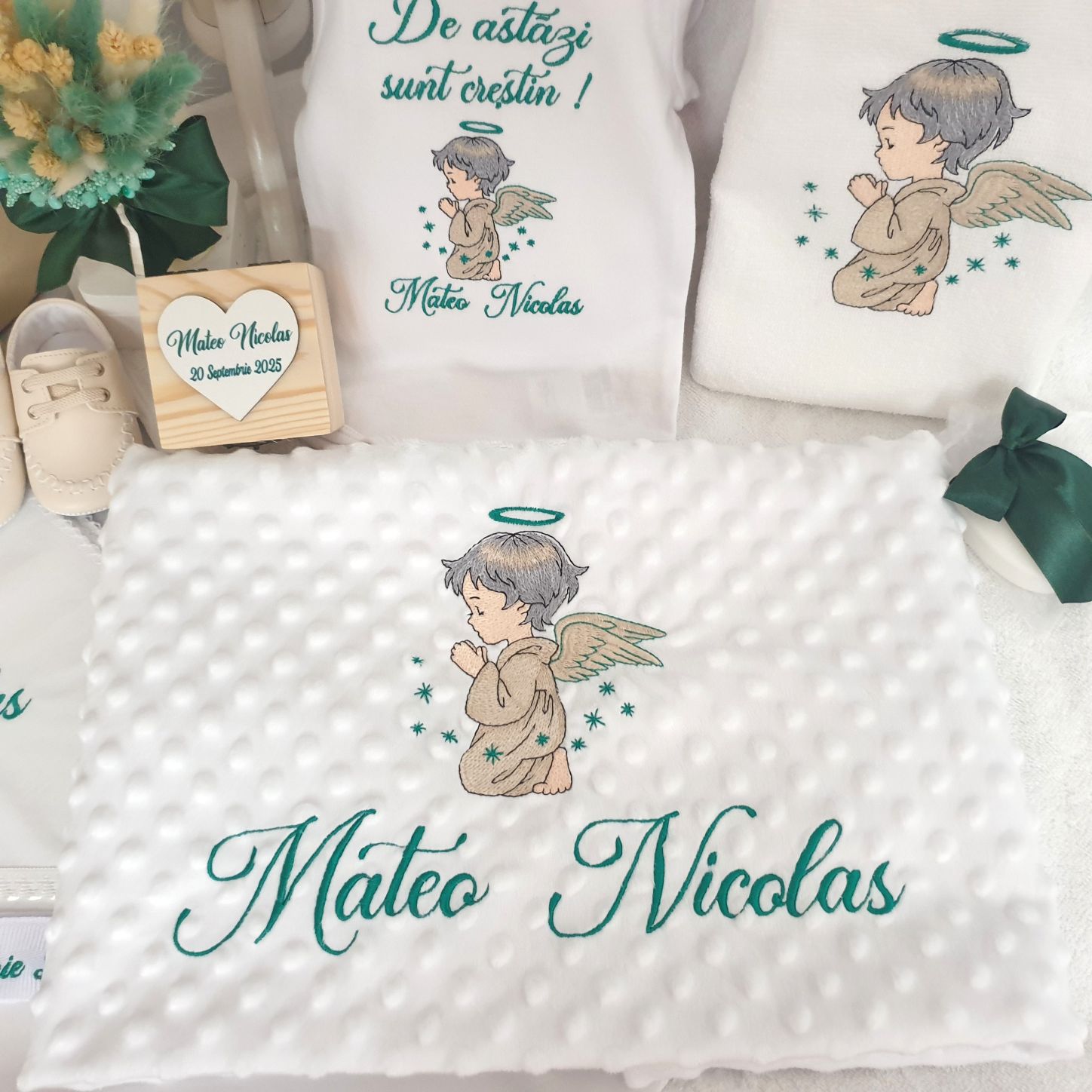 11.Body maneca lunga sau scurta personalizat cu mesaj”De astazi sunt crestin”,cu imagine si nume,din bumbac organic.Body se inchide in partea de jos cu 3 capse.(Dimensiuni body:56,62,68,74,80,86,92,98)