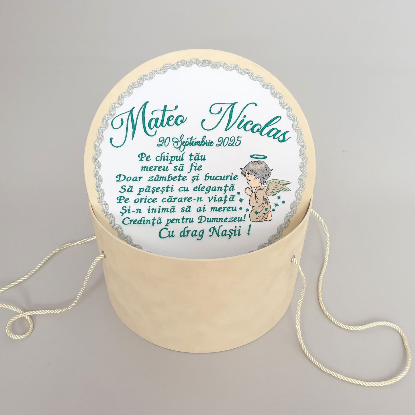2. Cutie catifea crem pentru trusou personalizată prin brodare cu numele bebelușului,data evenimentului(sau data nasterii),imagine si mesaj nasi