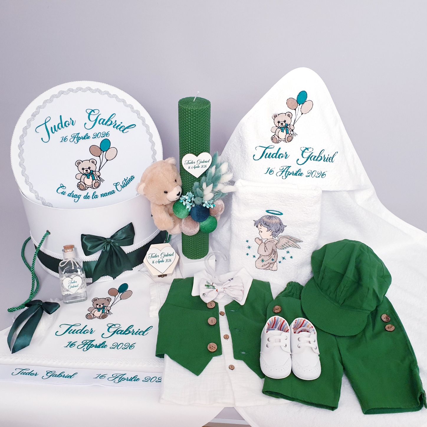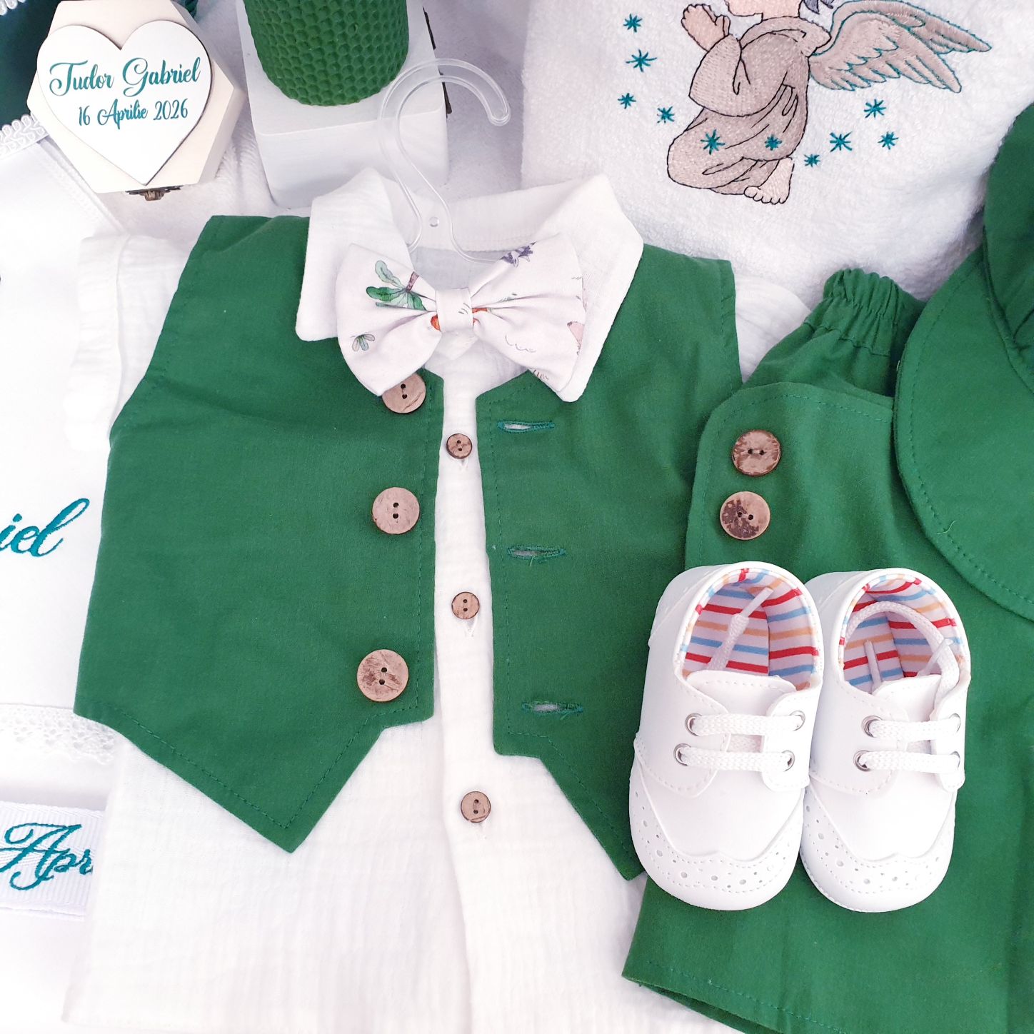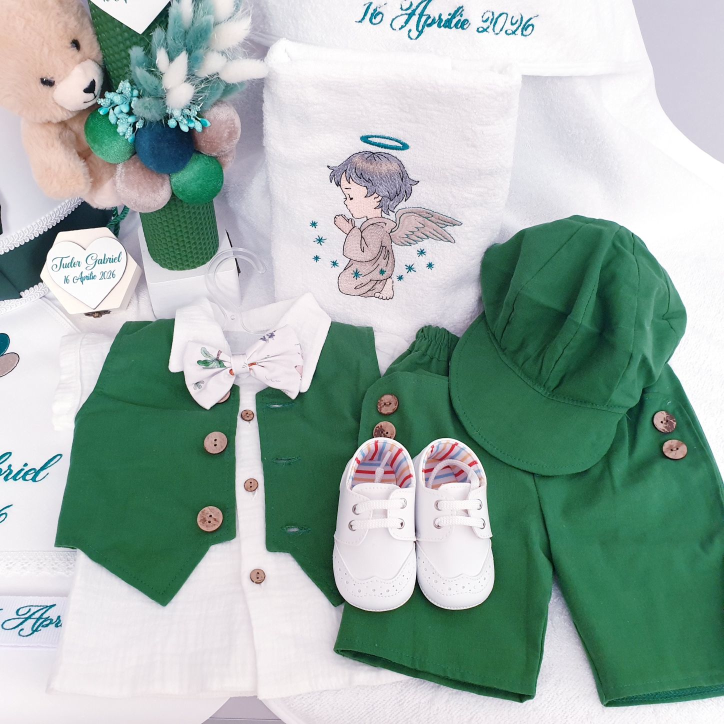 10.Costum Botez culoare verde confectionat din in. Este compus din 5 piese ce confera o tinuta elganta