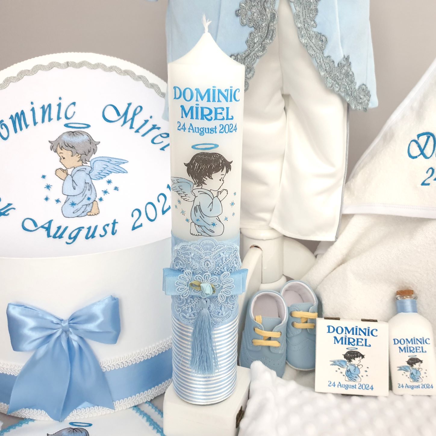1. Lumânare de botez personalizată cu imagine+nume (6.5 x 35 cm).Lumanarea este realizata handmade, imaginea cu ingerasul,data si numele sunt imprimate in ceara ,este decorata la baza cu maner din snur satinat