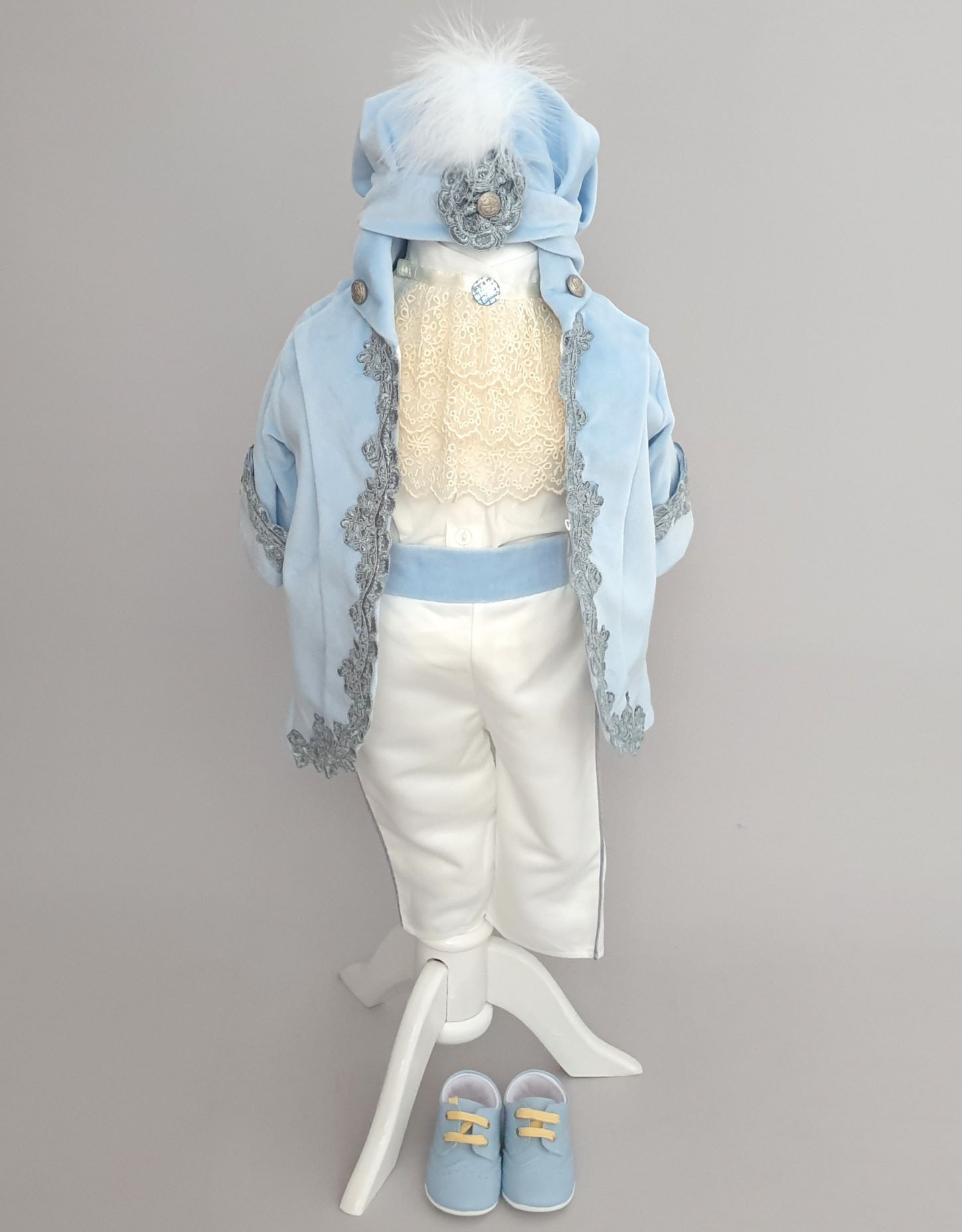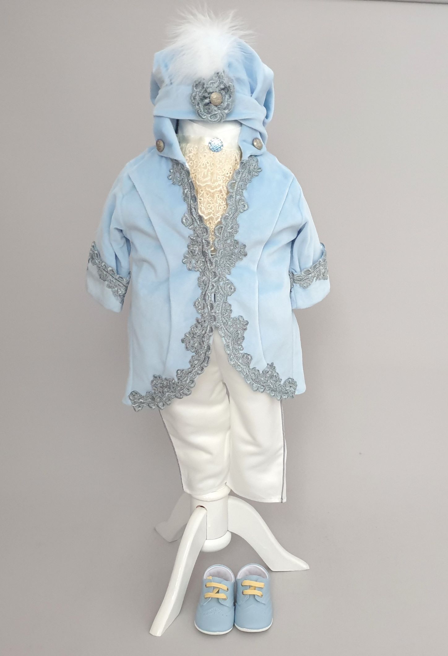 11. Costumul de botez conține 5 piese: pantaloni, redingotă, cămașă, jabou, șepcuță.Catifeaua costumului este moale și intens colorată în nuanțe de cerneală, bleu ciel.