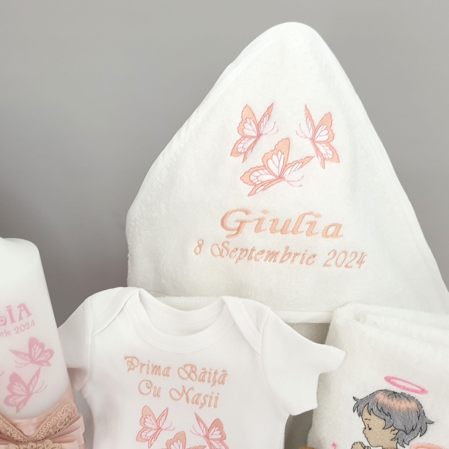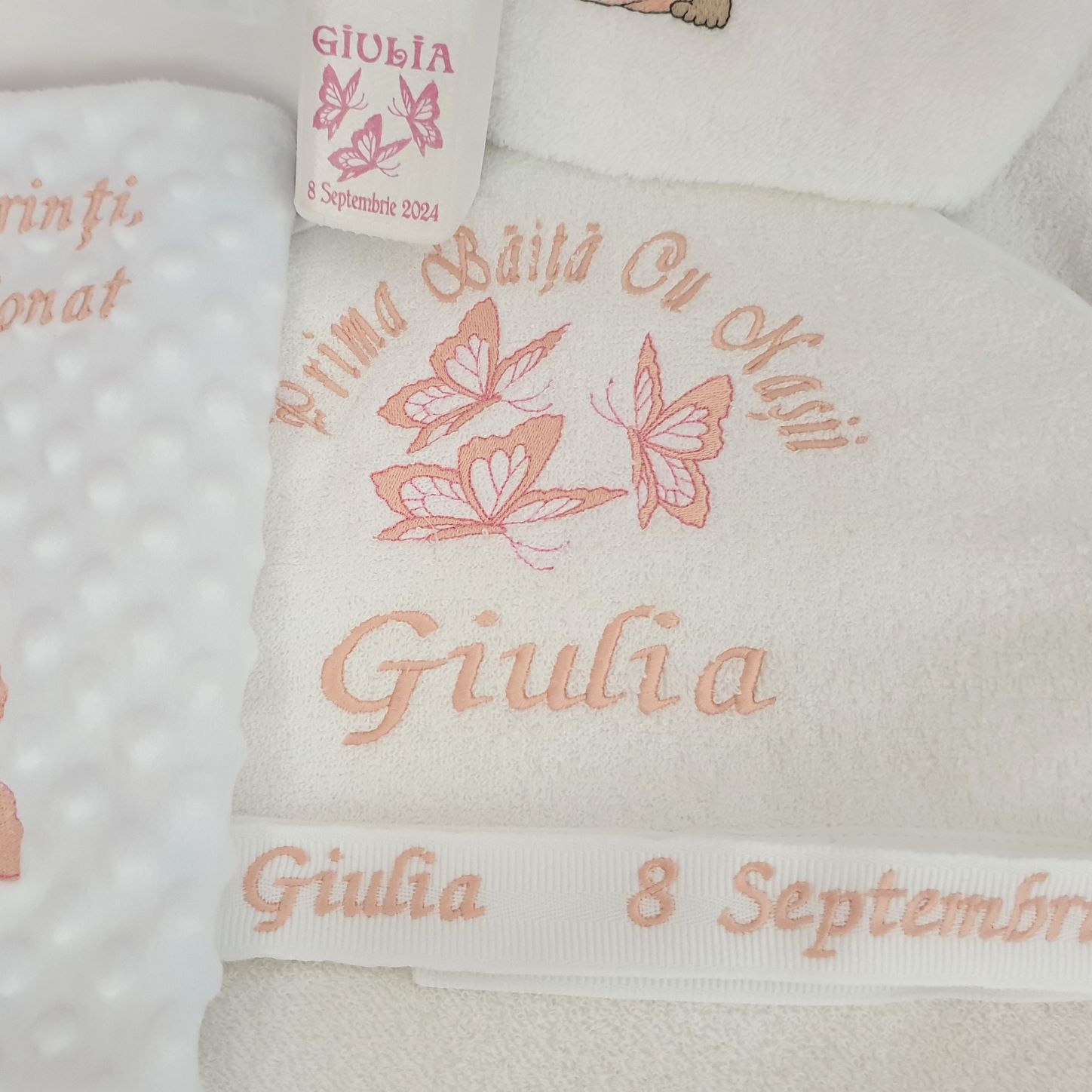 3. Prosop bebe cu capison , bumbac 100%,personalizat prin broderie cu imagine+nume+data (80x80cm )