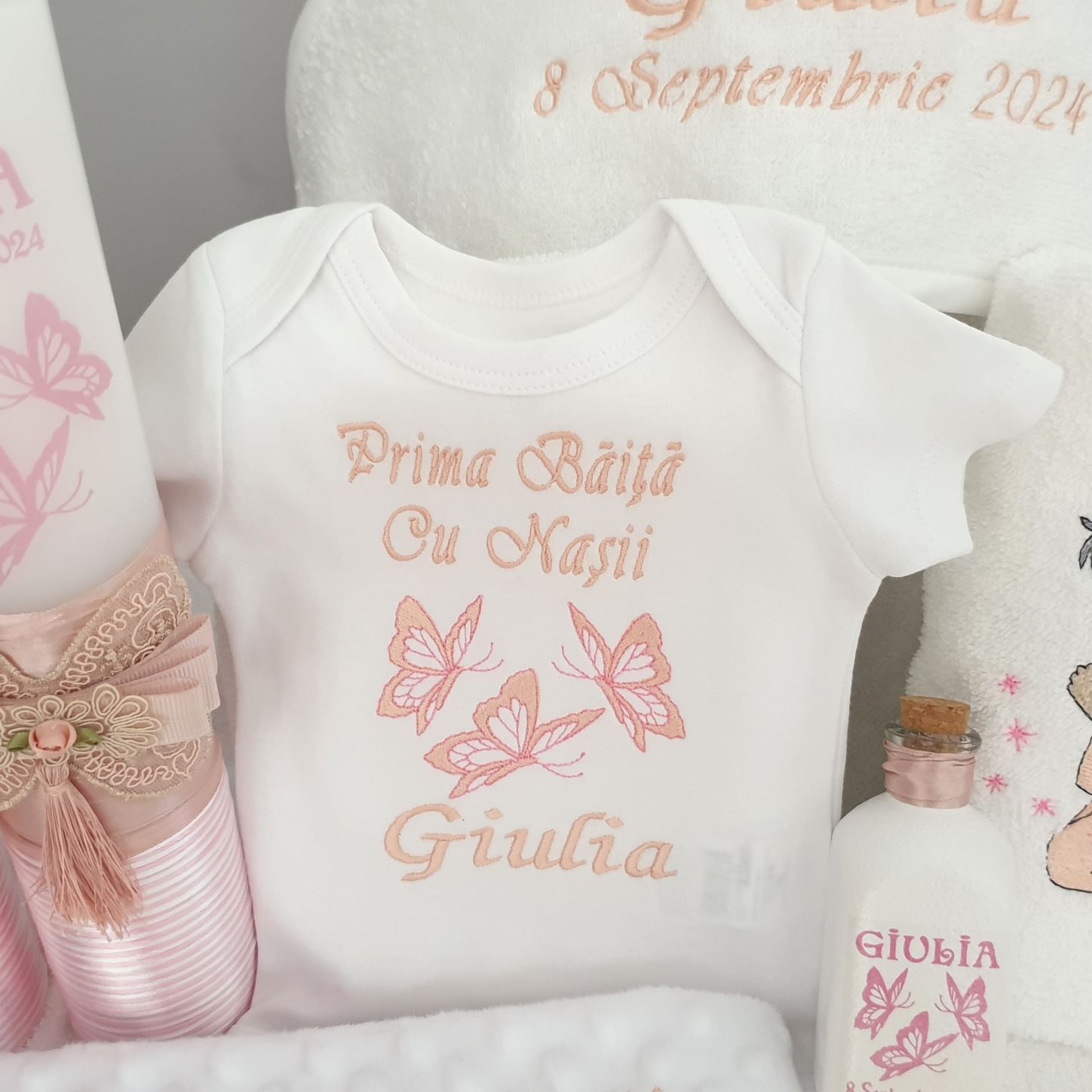 12.Body maneca lunga(sau scurta) personalizat cu imagine,text „Prima baita cu nasii” si nume,din bumbac organic.Body se inchide in partea de jos cu 3 capse.(Dimensiuni body:56,62,68,74,80,86,92)
