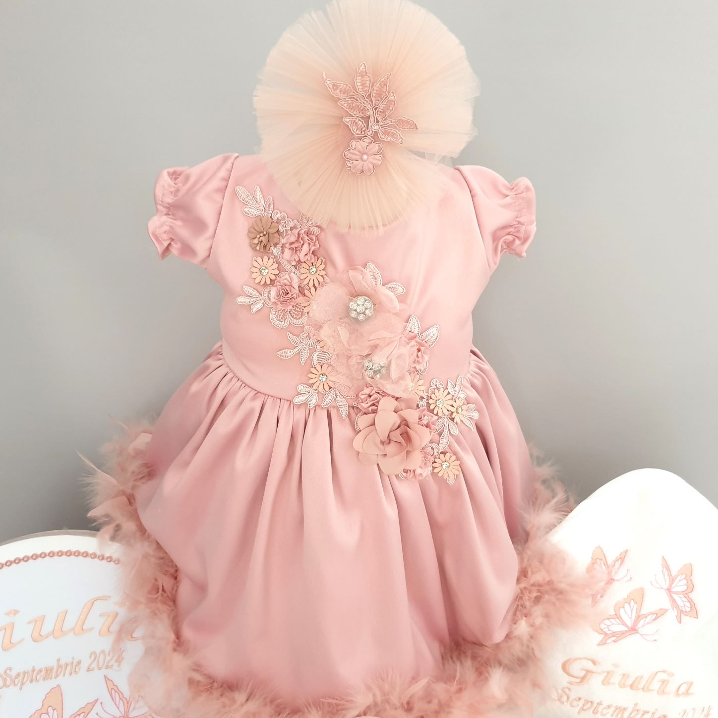Tinuta este intregita cu o bentiță delicată, care se potriveste perfect cu design-ul rochiei. Aceasta bentiță poate fi ajustată pentru a se potrivi perfect cu capul copilului si adaugă o notă de eleganta si delicatete.Penele, plasate cu grija, creeaza un detaliu subtil si elegant, amintind de ingerasii care vegheaza asupra micutei in aceasta zi speciala.