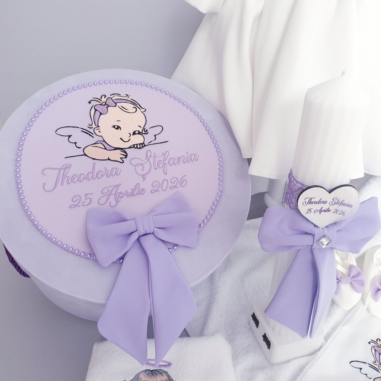 1. Lumânare de botez din parafina cu model canelat de culoare alba (6.5 x 35 cm),decorata manual cu funda mare lila. Lumanarea vine personalizata cu numele bebelusului pe o inimioara de lemn gravata manual