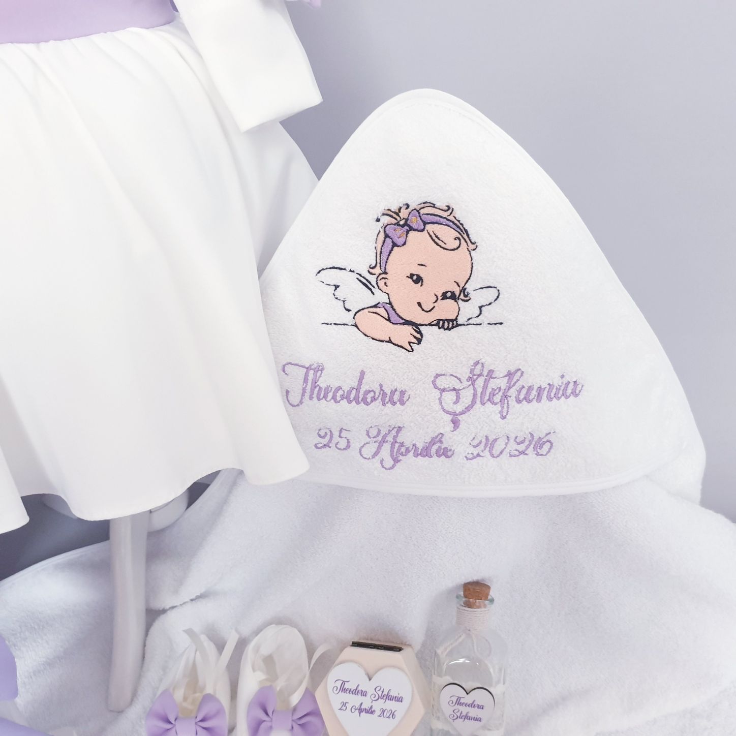 3. Prosop bebe cu capison , bumbac 100%,personalizat prin brodare cu imagine+nume +data(80x80cm )