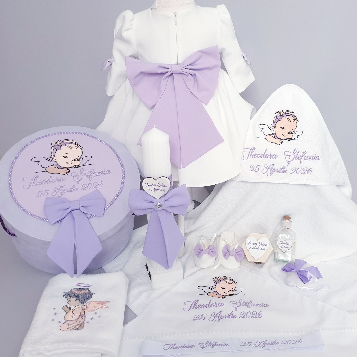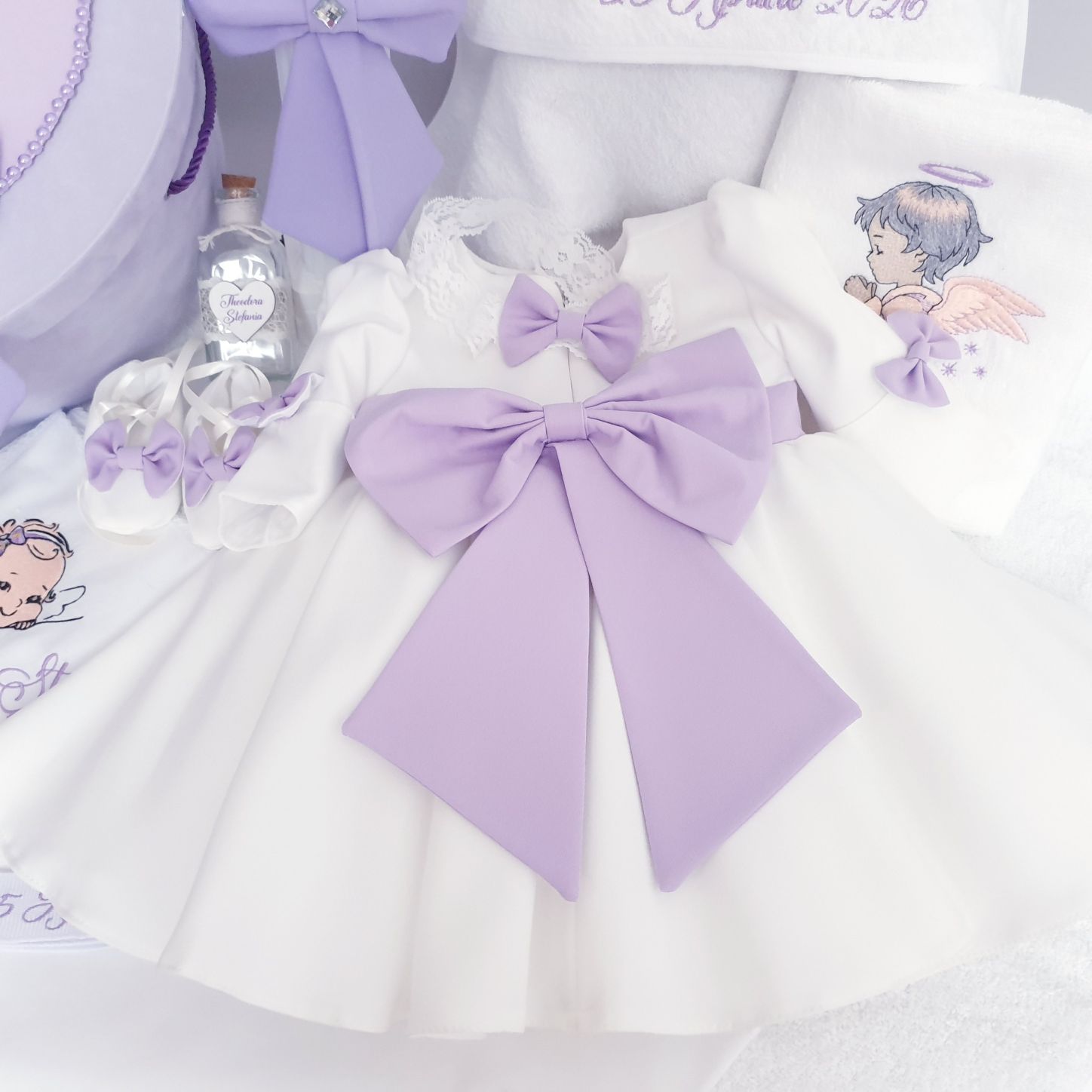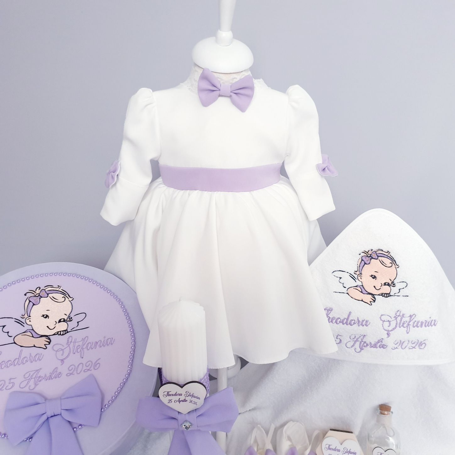10.Rochita botez alba cu o fundă lila mare la spate într-o culoare vie cu maneca lunga sau scurta, această ținută adaugă un strop de farmec fiecărei apariții.Mânecuțele sunt decorate cu fundițe elegante de culoare lila oferind un plus de sofisticare.Setul complet include o bentiță delicată cu fundiță și papucei adorabili, asortați perfect cu rochița.Aceasta rochita de botez redefineste eleganta si puritatea, fiind creata special pentru un moment unic si deosebit.Sistem de inchidere: cu fermoar la spate. Produs fabricat in Romania
