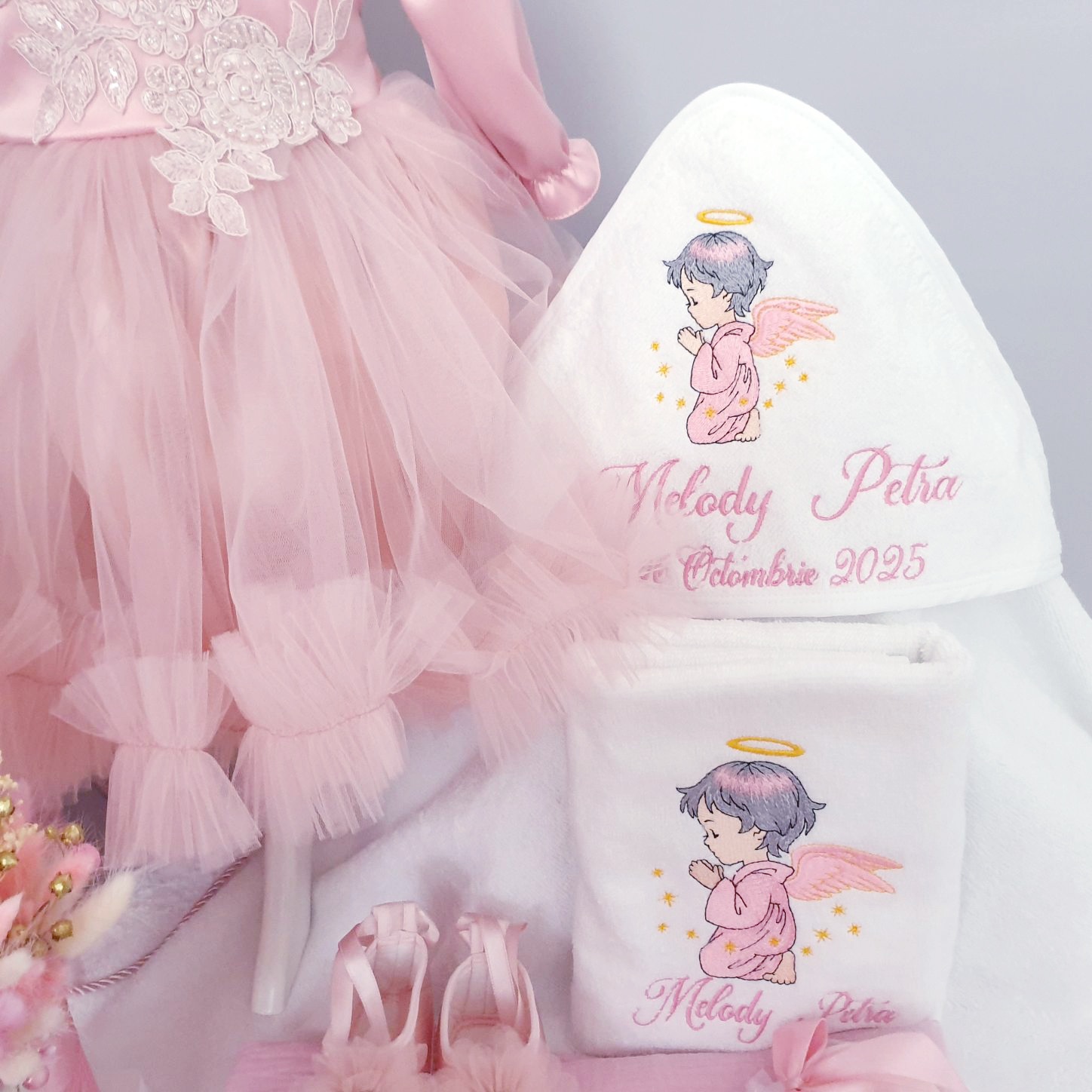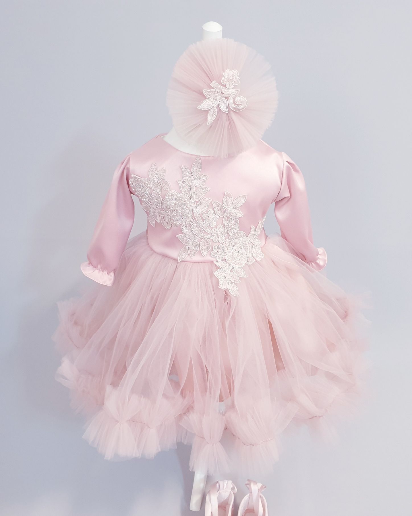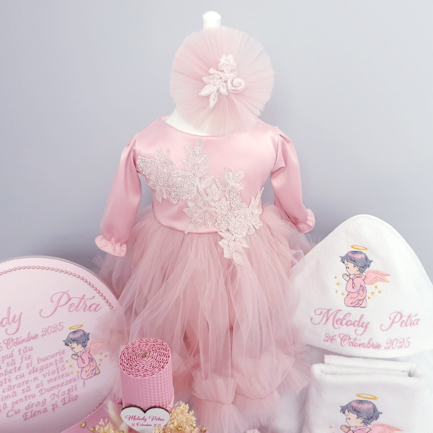 11.Rochița pentru botez, culoare roz prăfuit, cu un design simplu, dar cu detalii delicate, cum ar fi dantela aplicată in partea superioară a rochiei, adăuga un farmec subtil ținutei. Este confecționată din tulle cu dantela pe exterior, iar interiorul este din bumbac și se inchide cu fermoar la spate, conține si bentiță asortată. Aceasta rochita de botez redefineste eleganta si puritatea, fiind creata special pentru un moment unic si deosebit. Produs fabricat in Romania.Rochita se realizeaza cu maneca scurta sau lunga in functie de sezon