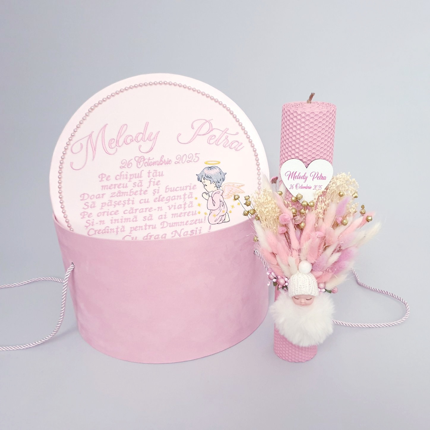 1.Lumanare Botez Ceara Naturala de culoare roz pudra(6.5 x 35 cm),decorata manual cu aranjament floral si Ingeras alb. Lumanarea vine personalizata cu numele bebelusului pe o inimioara de lemn gravata manual.Elementele sunt confectonate manual si vor rezista ani intregi dupa eveniment, astfel lumanarea va ramane o amintire peste ani si ani!