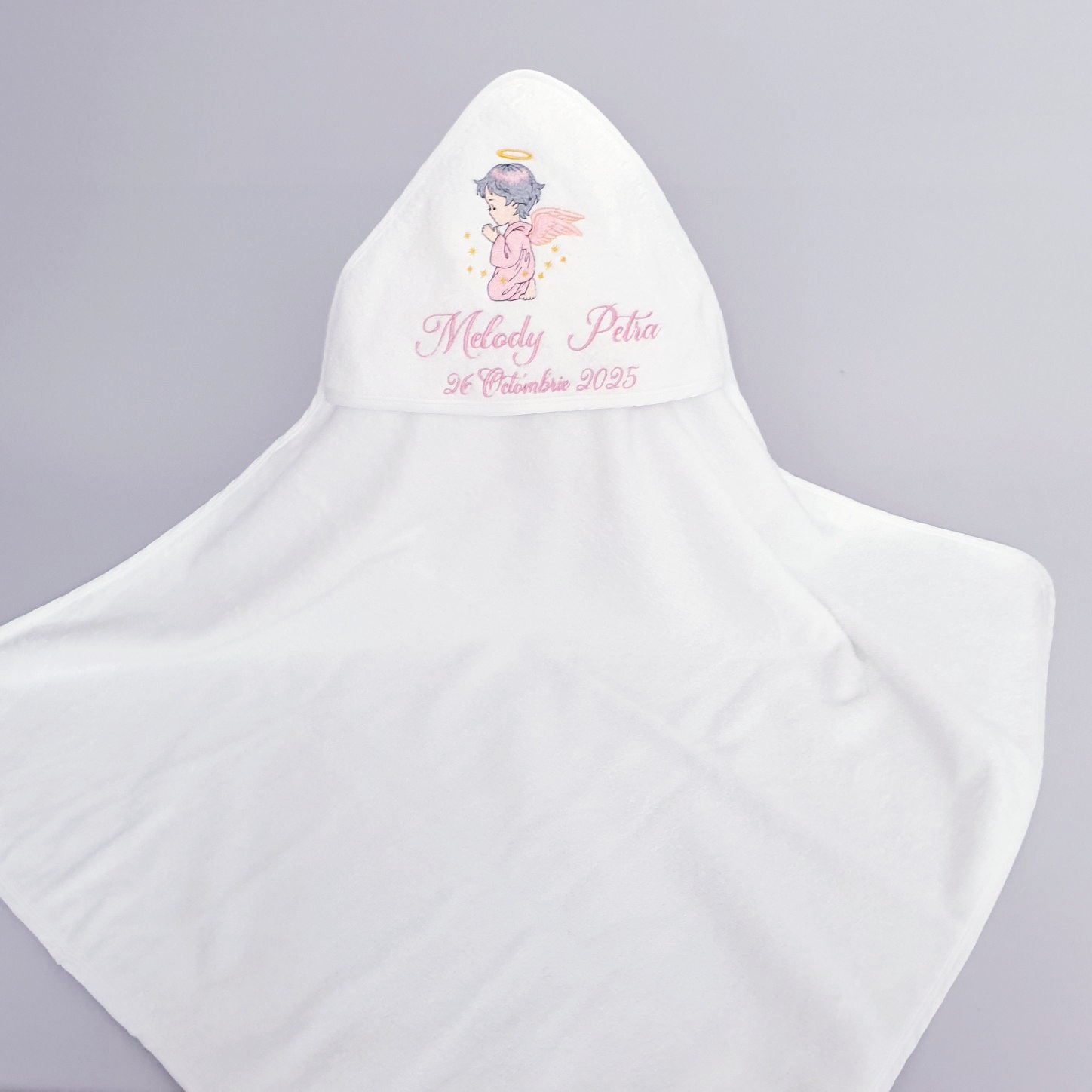 3. Prosop bebe cu capison , bumbac 100%,personalizat prin brodare cu imagine+nume +data(80x80cm )