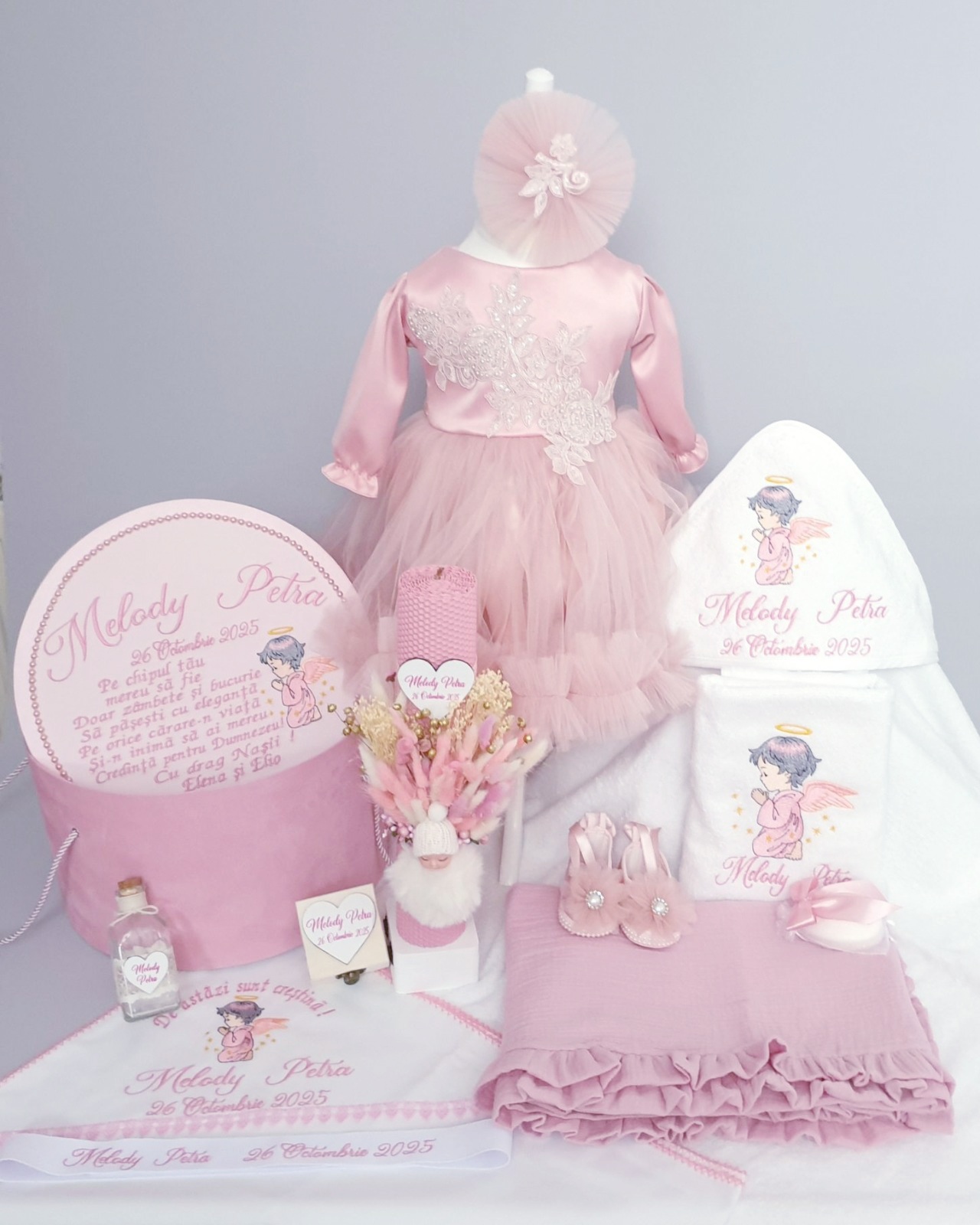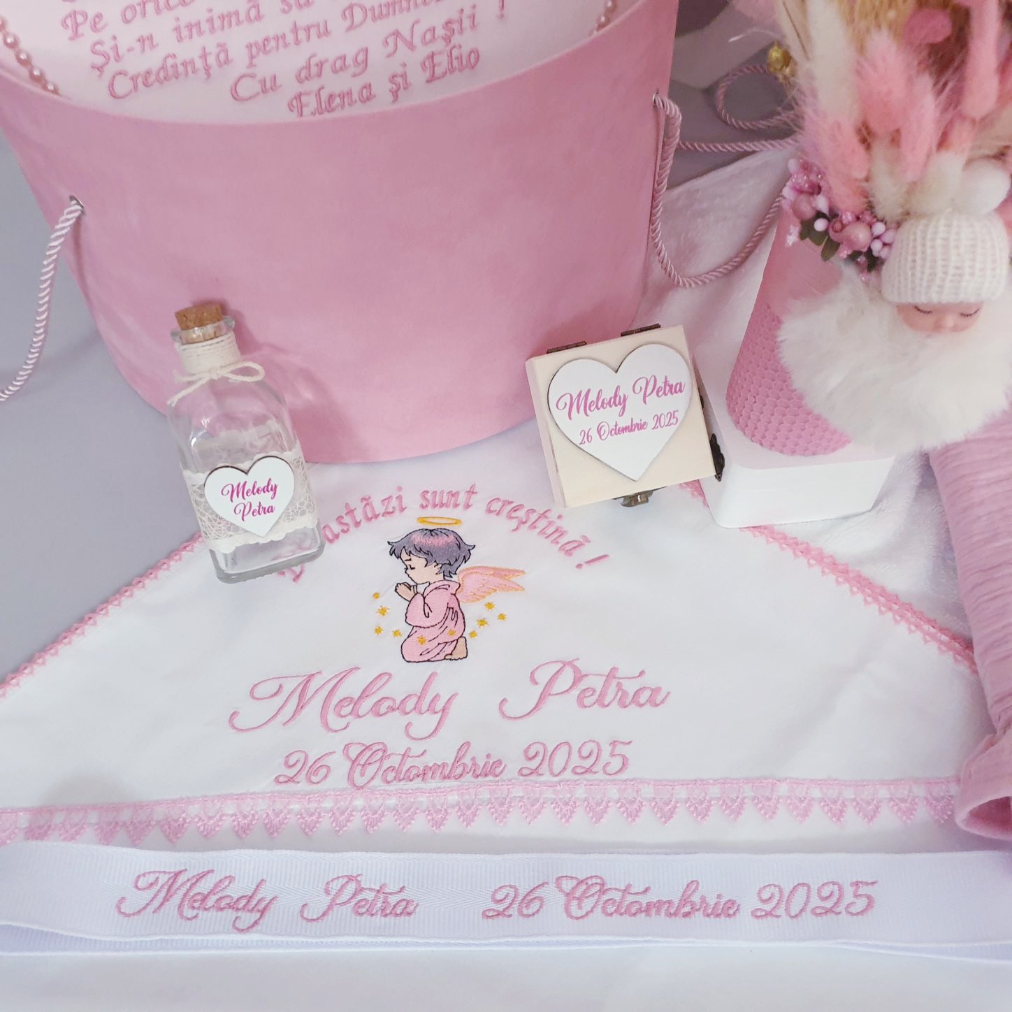 2. Cutie pentru trusou din catifea roz pudra ,capacul cutiei este personalizat cu mesaj, numele bebelușului , imagine si data. Dimensiuni cutie: diametru 35 cm / înălțime 20 cm