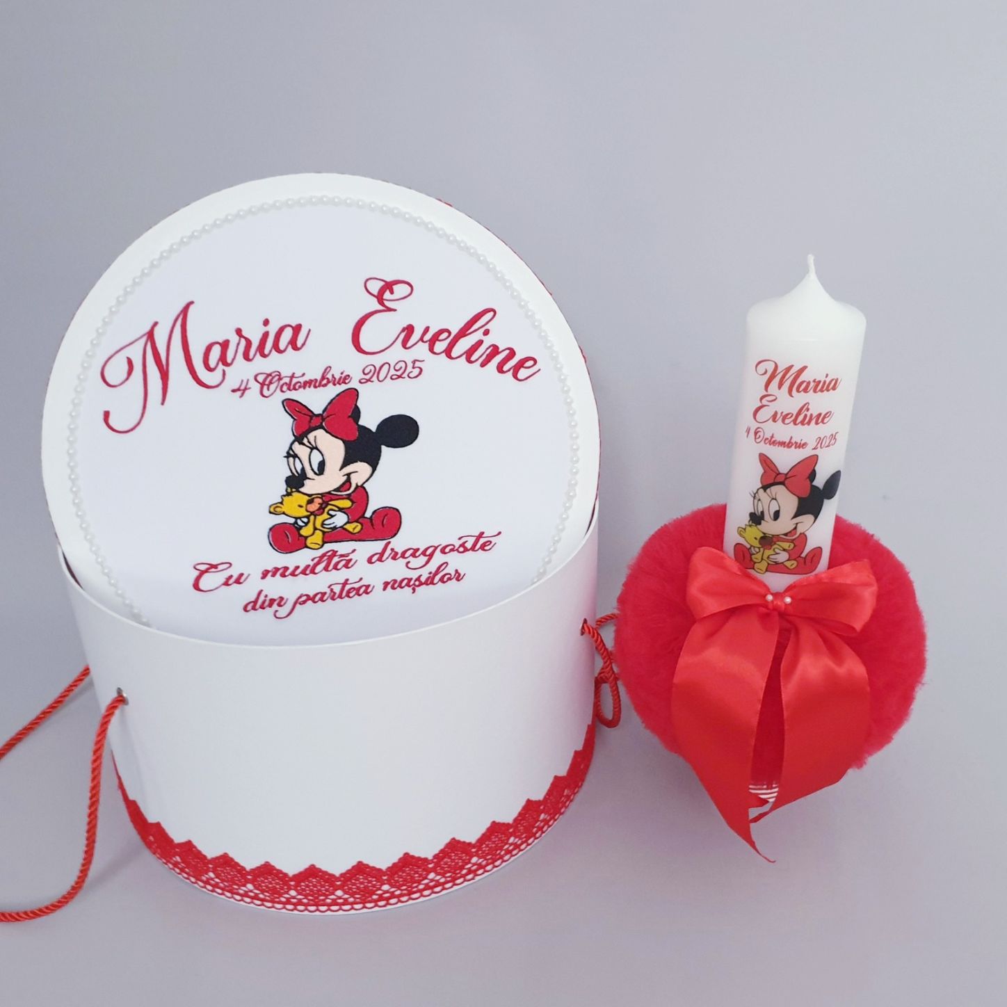 1. Lumânare de botez personalizată cu imagine+nume(6.5 x 35 cm).Lumanarea este realizata handmade, imaginea cu MINNIE MOUSE si numele sunt imprimate in ceara , este ornata cu tull fin rosu, satin rosu si alte elemente decorative ,iar manerul cu snur satinat