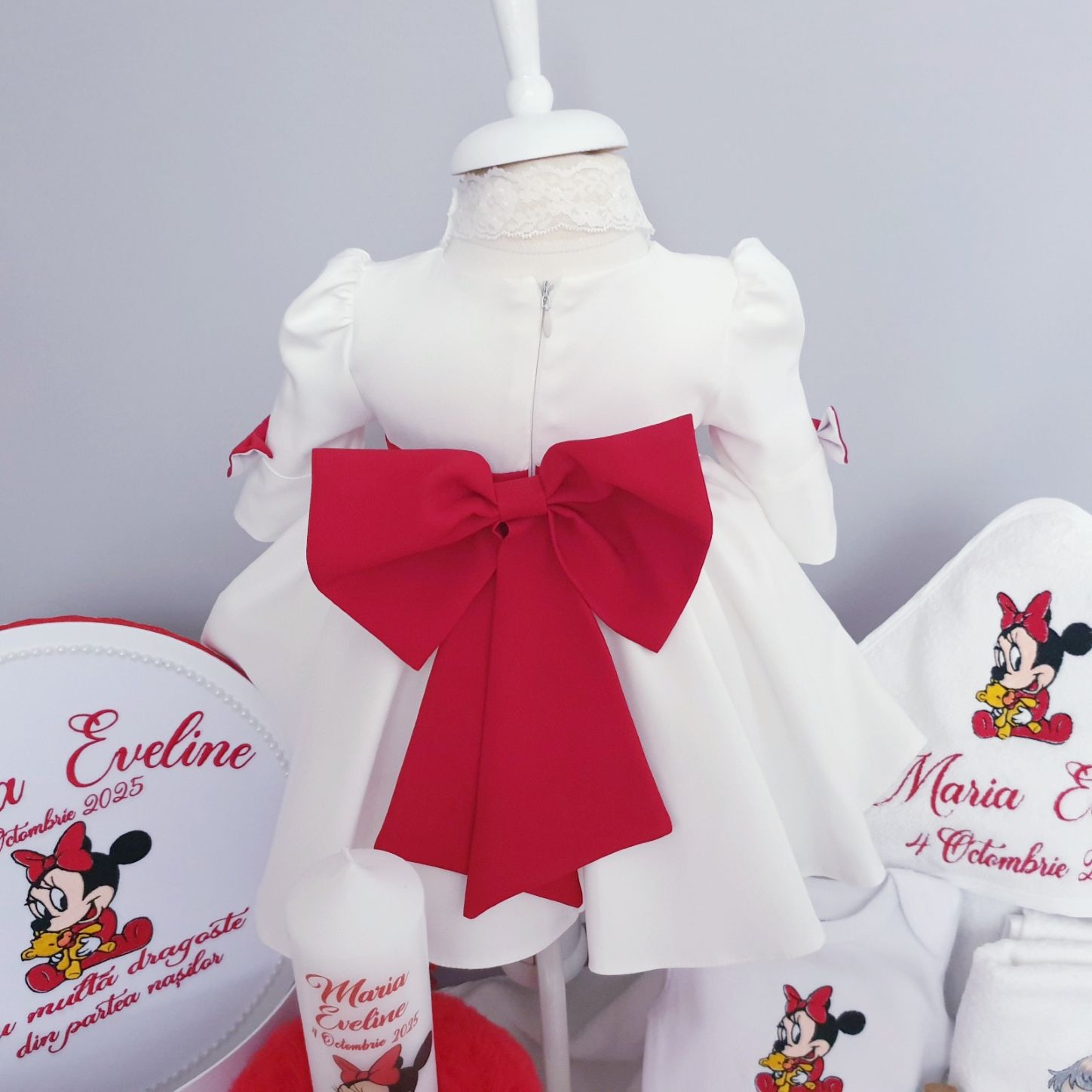 12.Rochita botez alba cu o fundă mare la spate într-o culoare vie rosie cu maneca lunga sau scurta, această ținută adaugă un strop de farmec fiecărei apariții.Mânecuțele lungi sunt decorate cu fundițe elegante, oferind un plus de sofisticare.Setul complet include o bentiță delicată cu fundiță și papucei adorabili, asortați perfect cu rochița.Aceasta rochita de botez redefineste eleganta si puritatea, fiind creata special pentru un moment unic si deosebit.Sistem de inchidere: cu fermoar la spate. Produs fabricat in Romania