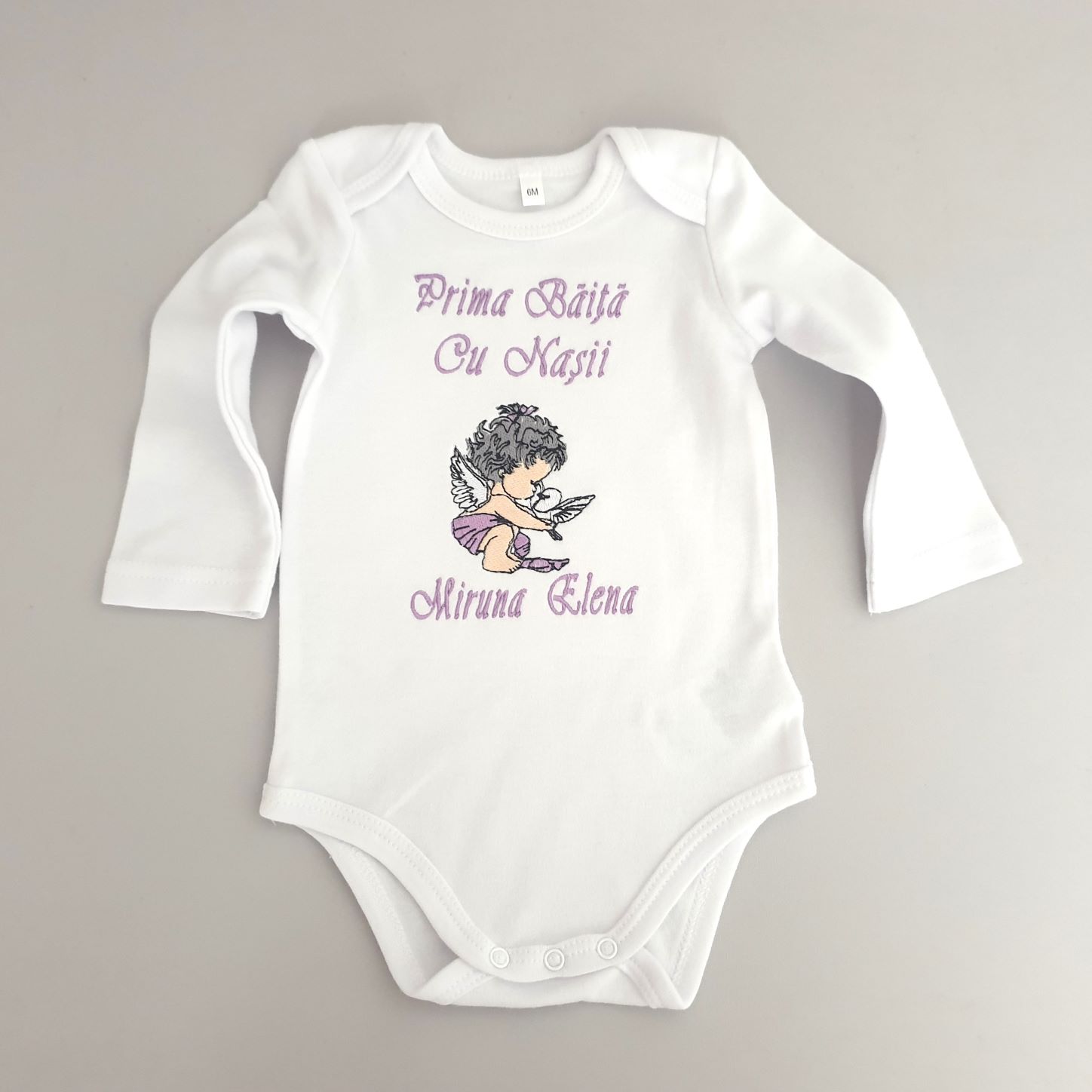 11.Body maneca lunga sau scurta personalizat cu imagine,text „Prima baita cu nasii” si nume,din bumbac organic.Body se inchide in partea de jos cu 3 capse.(Dimensiuni body:56,62,68,74,80,86,92)
