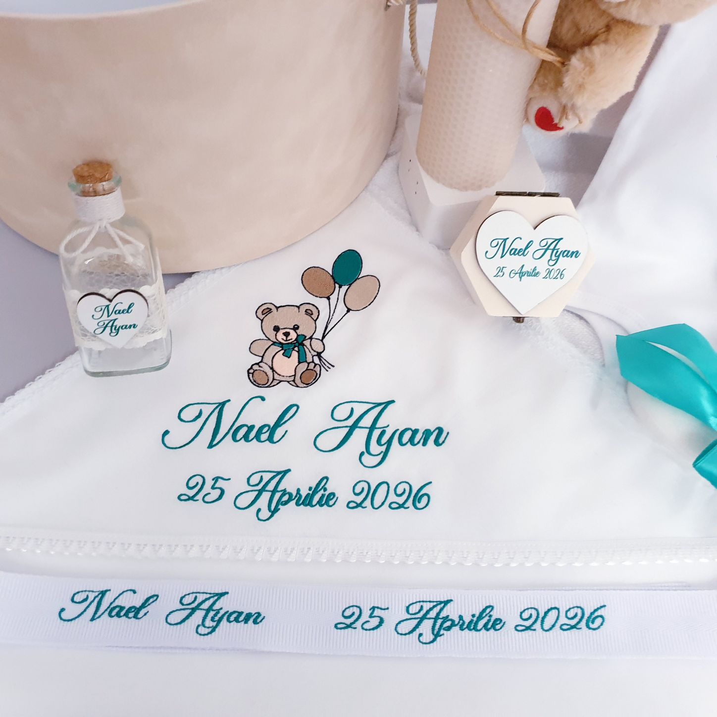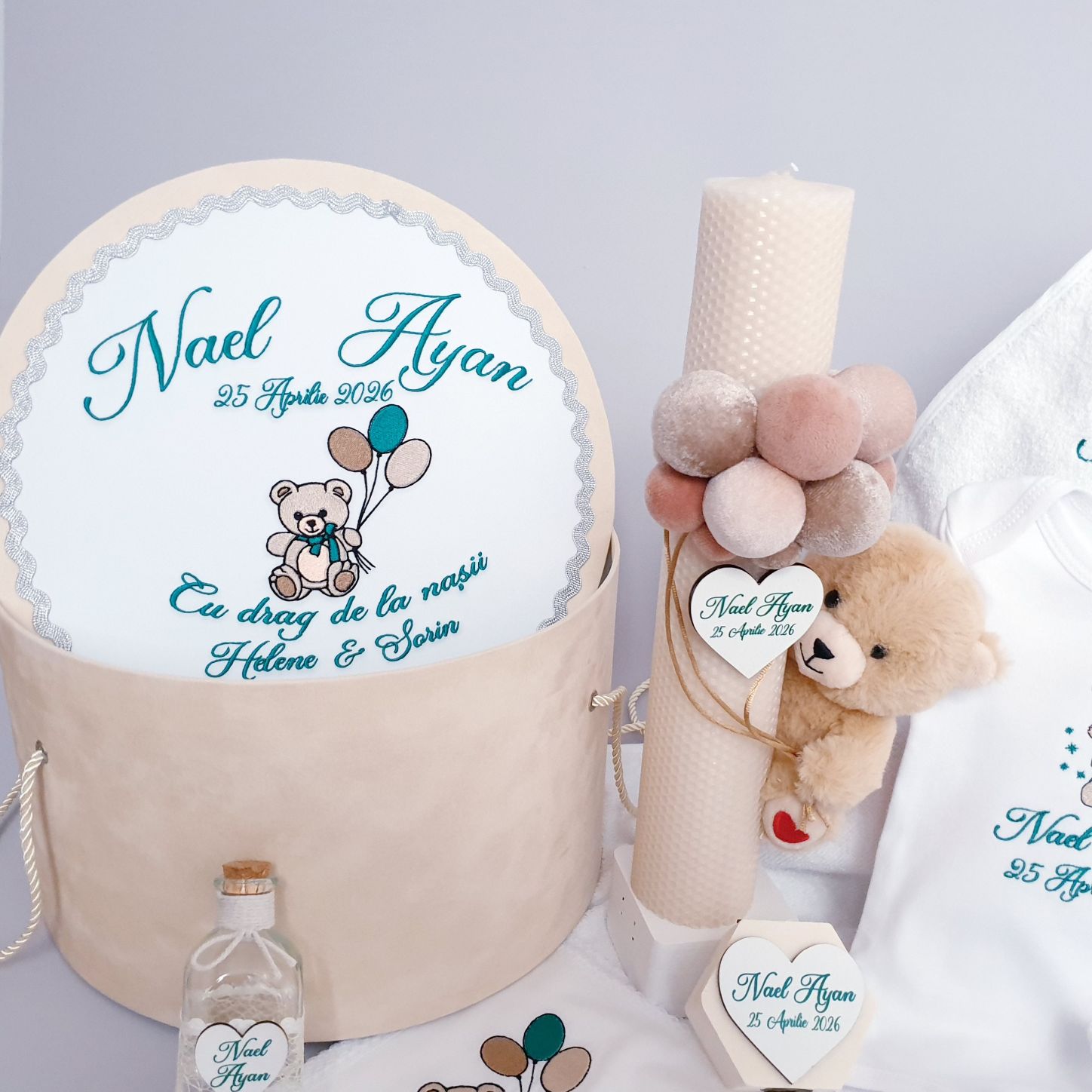 2. Cutie catifea crem pentru trusou personalizată prin brodare cu numele bebelușului,data evenimentului(sau data nasterii) si imagine