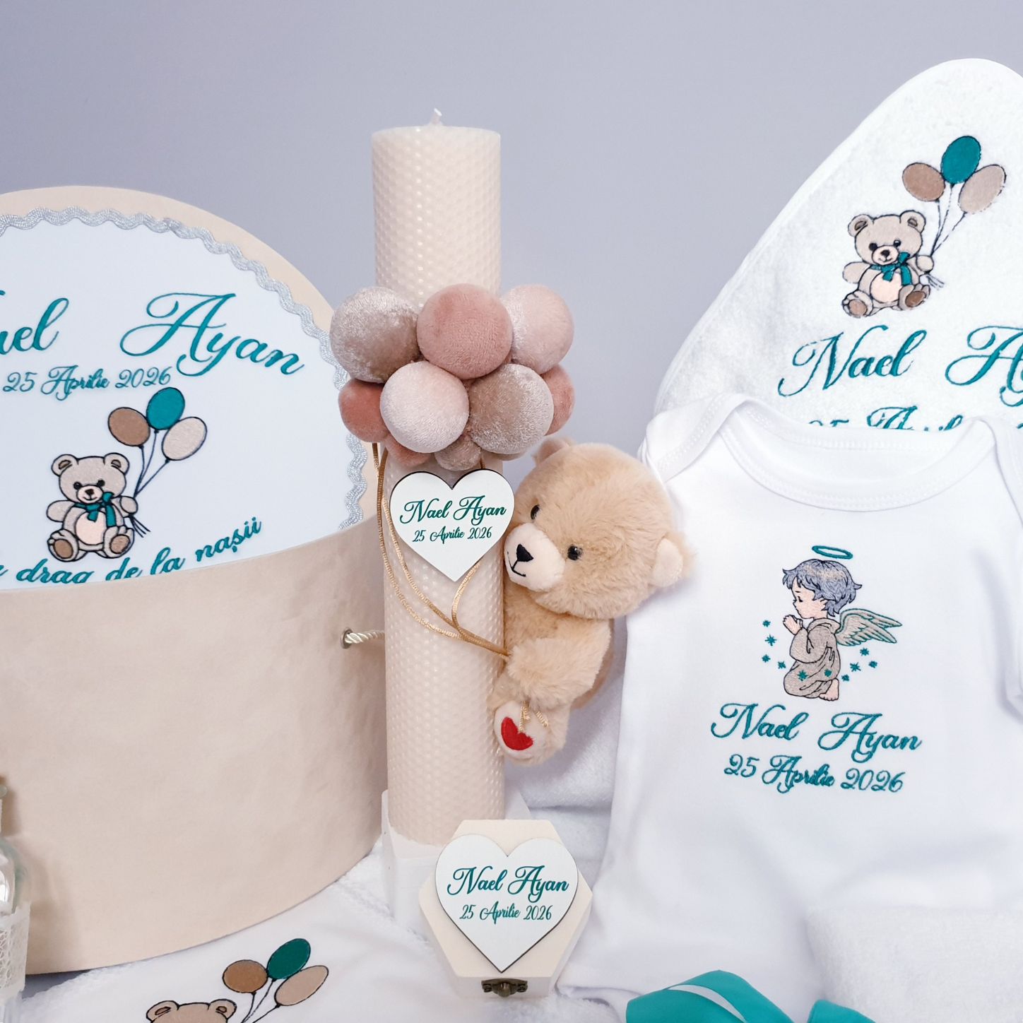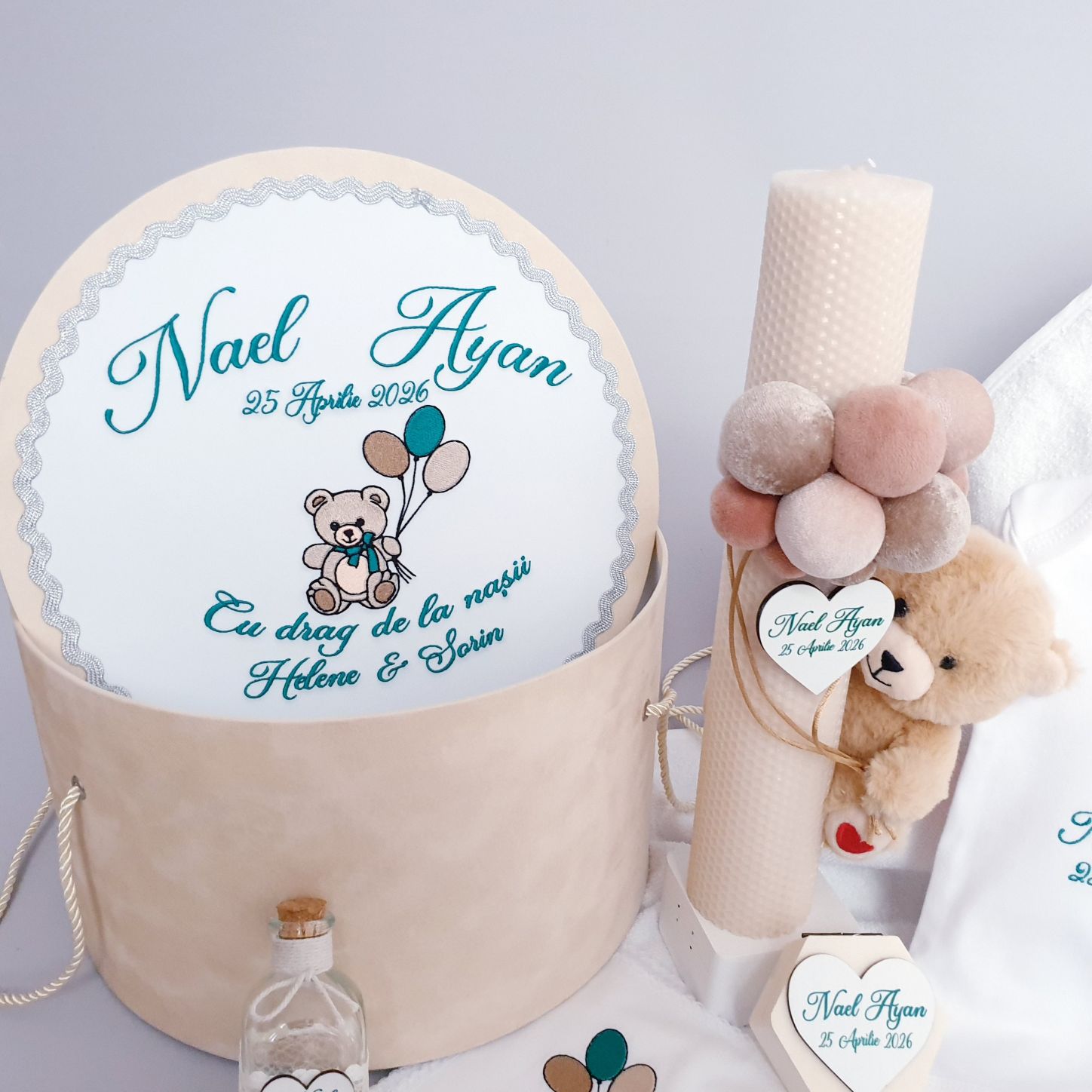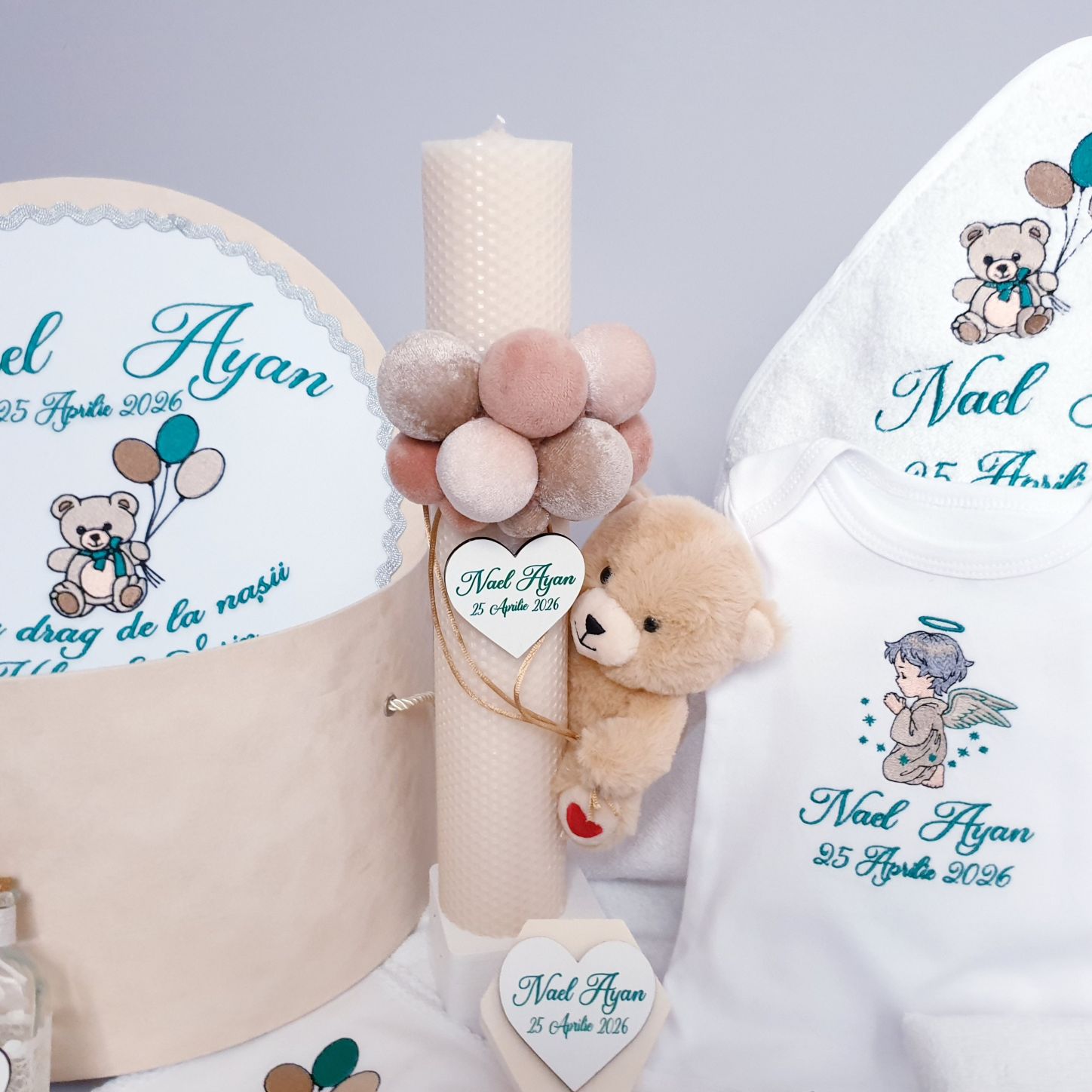 1. Lumânare de botez din ceara naturala de culoare crem personalizată cu nume si data evenimentului(6 cm x 35 cm).Decorata cu aranjament si ursulet.Elementele sunt confectonate manual si vor rezista ani intregi dupa eveniment, astfel lumanarea va ramane o amintire peste ani si ani! Această lumânare este un produs special creat pentru a aduce o notă de eleganță și tradiție în ceremonia copilului tău. Realizată manual din ceară naturală, această lumânare este decorată cu atenție la detalii pentru a se potrivi perfect cu atmosfera solemnă a evenimentului.Pe o inimioara din lemn este gravat numele copilului si data botezului.